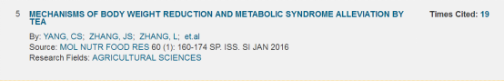 此外,我校作为第二单位,与美国Rutgers大学CS Yang教授联合发表在Mol Nutr Food Res,2016,60(1):160-174,题为Mechanisms of body weight reduction and metabolic syndrome alleviation by tea的综述文章,入选农业科学领域高被引论文。CS Yang教授为此文的第一作者和通讯作者。CS Yang教授为我院讲席教授,同时为我校茶叶化学与健康教育部国际合作联合实验室的外方主任。
