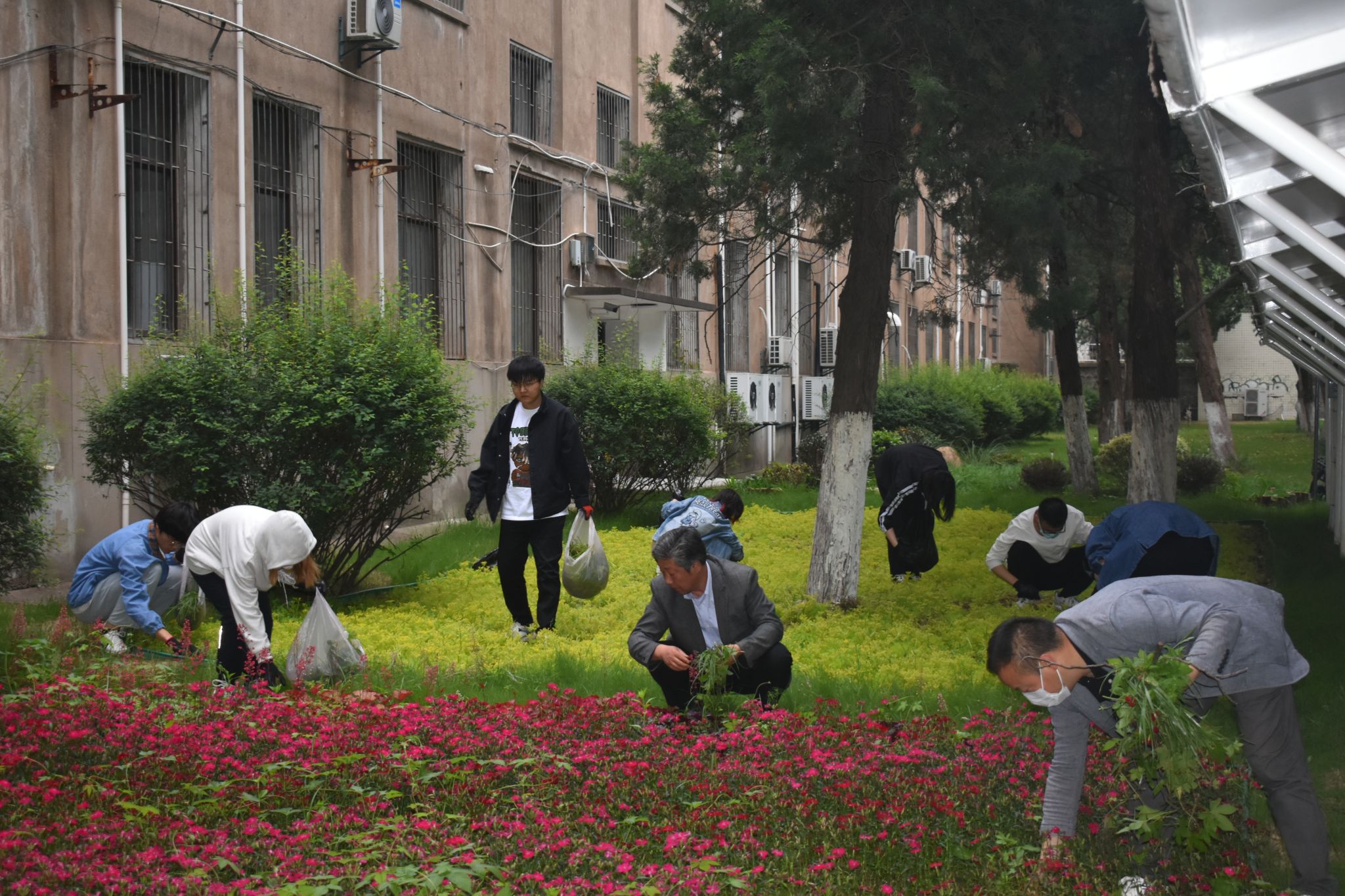 同学们在二教楼前领取除草手套和垃圾袋,随后各自在指定的区域清理杂草。活动中,大家撸起袖子、弯下身,分工合作、埋头苦干,将二教周围草坪的杂草拔除,并收集在规定区域内做进一步集中处理。经过全体人员的努力,杂草尽除,草坪重新焕发着生机与活力。