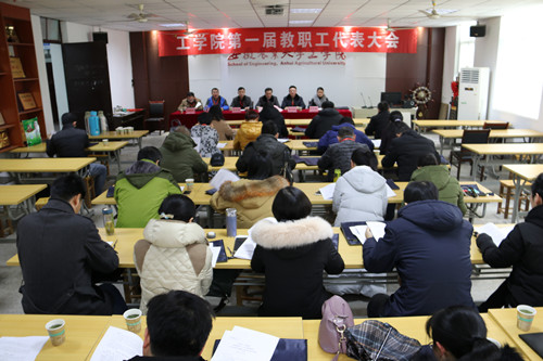 本网讯 1月19日下午,工学院第一届教职工大会在学院202教室召开。本次会议应到代表36人,因事请假3人,共有33名代表参加了会议。校党委委员、工会主席张久辉,工会副主席吴冬梅莅临会议并给予指导。会议由院党委书记甘传鹤主持。