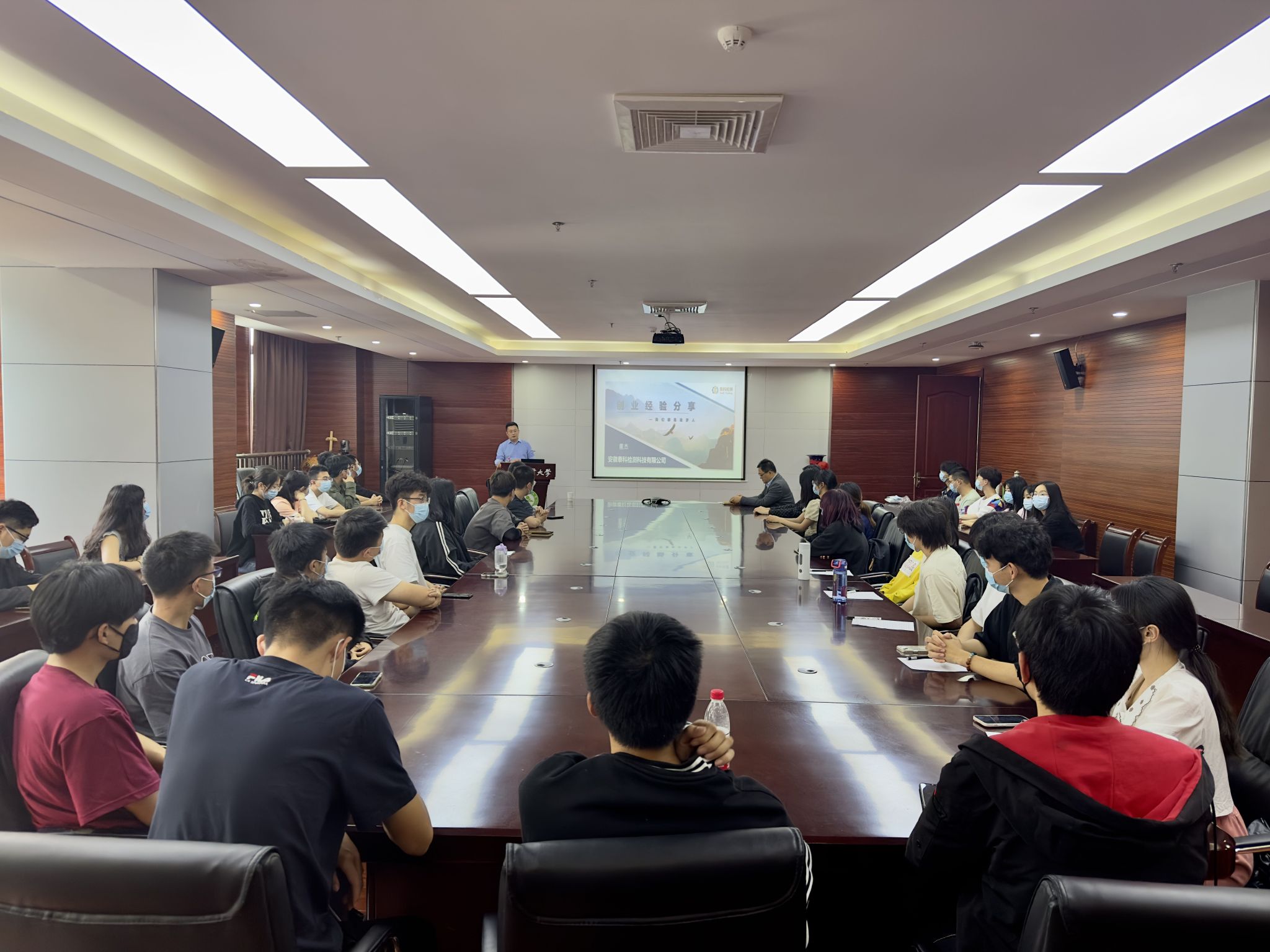 董杰回顾了在安徽农业大学的求学时光,介绍了自己所在企业的发展情况,以及业务范围、重点项目、最新成果和未来发展方向。他结合习近平总书记关于青年的重要论述和学习党的二十大精神心得感悟,讲述了自己毕业后工作的奋斗历程和创业故事。他表示,作为学校的就业实习基地,安徽泰科检测科技有限公司将努力为资环学子提供更多实习实践锻炼机会,服务人才培养质量提升。