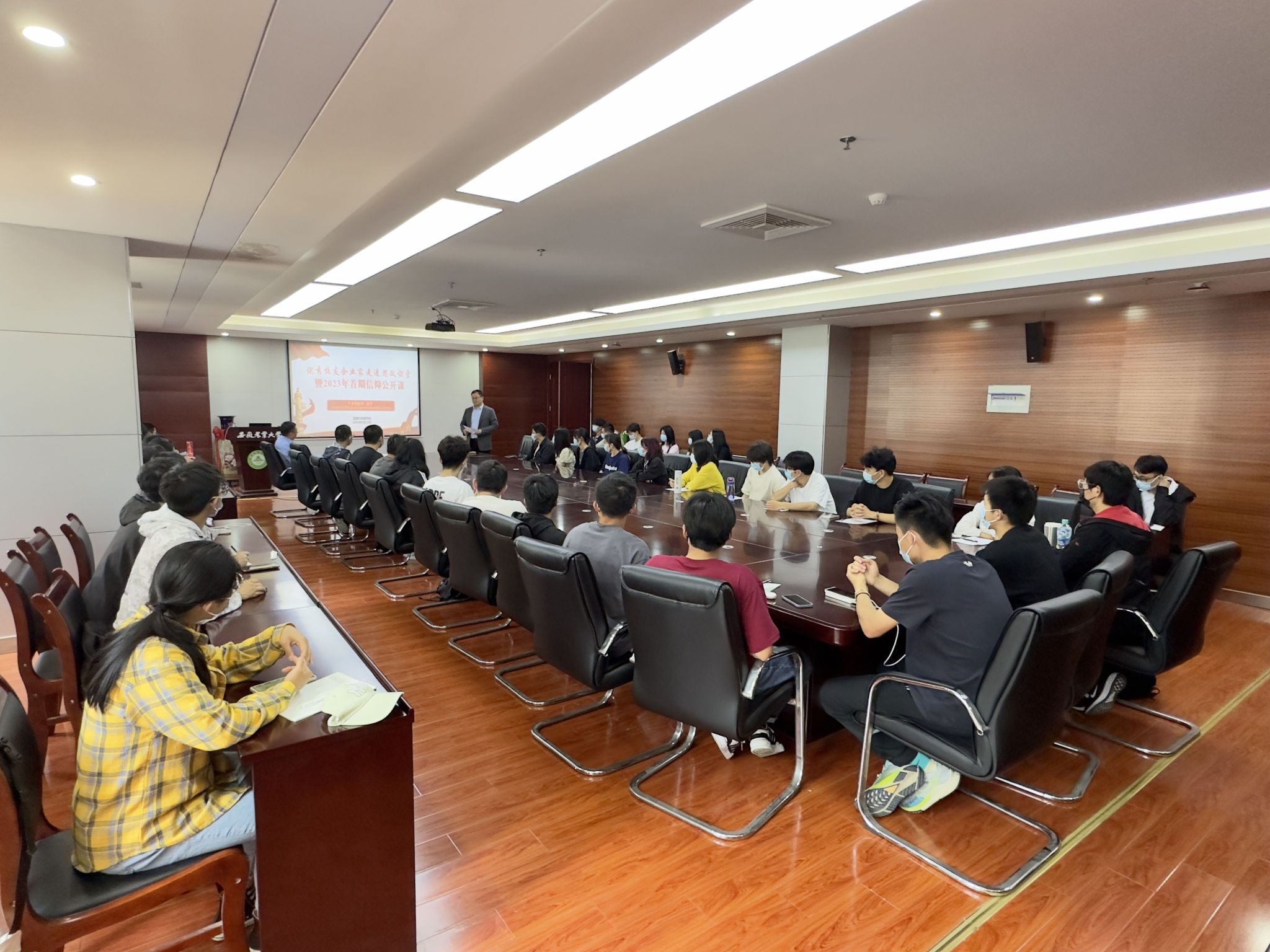 本网讯 为扎实开展学习贯彻习近平新时代中国特色社会主义思想主题教育,落实落细习近平总书记关于开展爱国卫生运动重要指示批示精神,5月12日下午,资源与环境学院举办“优秀校友企业家走进思政课堂”暨2023年首期信仰公开课,我校2006届环境工程专业校友、安徽泰科检测科技有限公司董事长董杰作专题报告,学院副院长张震主持活动,教师代表、学生代表、65期入党积极分子培训班学员、入团积极分子听取报告。