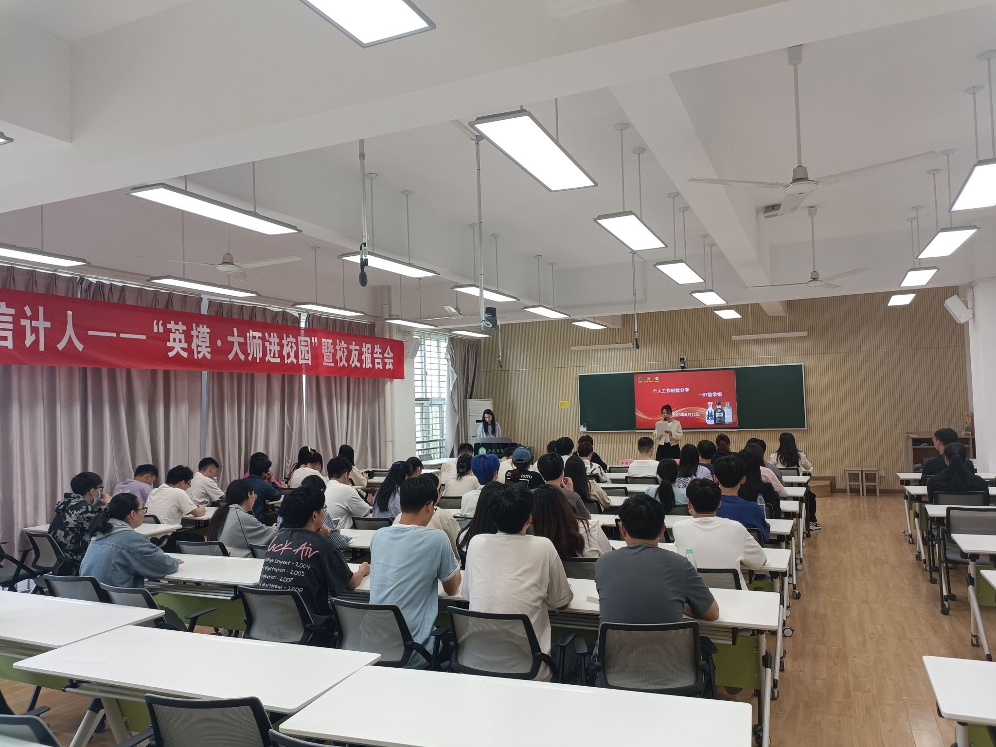 励志成长,引领未来,成就人生华章。为教育引导学生争做新时代的奋斗者,引导学生们树立正确的世界观、人生观和价值观,5月12日下午,学院在305教室开展“英模·大师进校园”暨校友报告会,学院2011届物流工程专业毕业生、全国巾帼标兵岗、古井贡酒采购中心仓储部经理马倩应邀回校作分享,马倩作为优秀校友的代表,传递了习近平总书记关于劳动的重要指示精神,引导学生们认识到劳动是实现个人价值和社会进步的基础,激发了他们对劳动的兴趣和热情。这次报告会为学生们提供了宝贵的学习和启发机会,使他们更加明确自己的职业发展方向,勇敢追寻梦想,并为实现个人价值和社会发展做出积极的贡献。