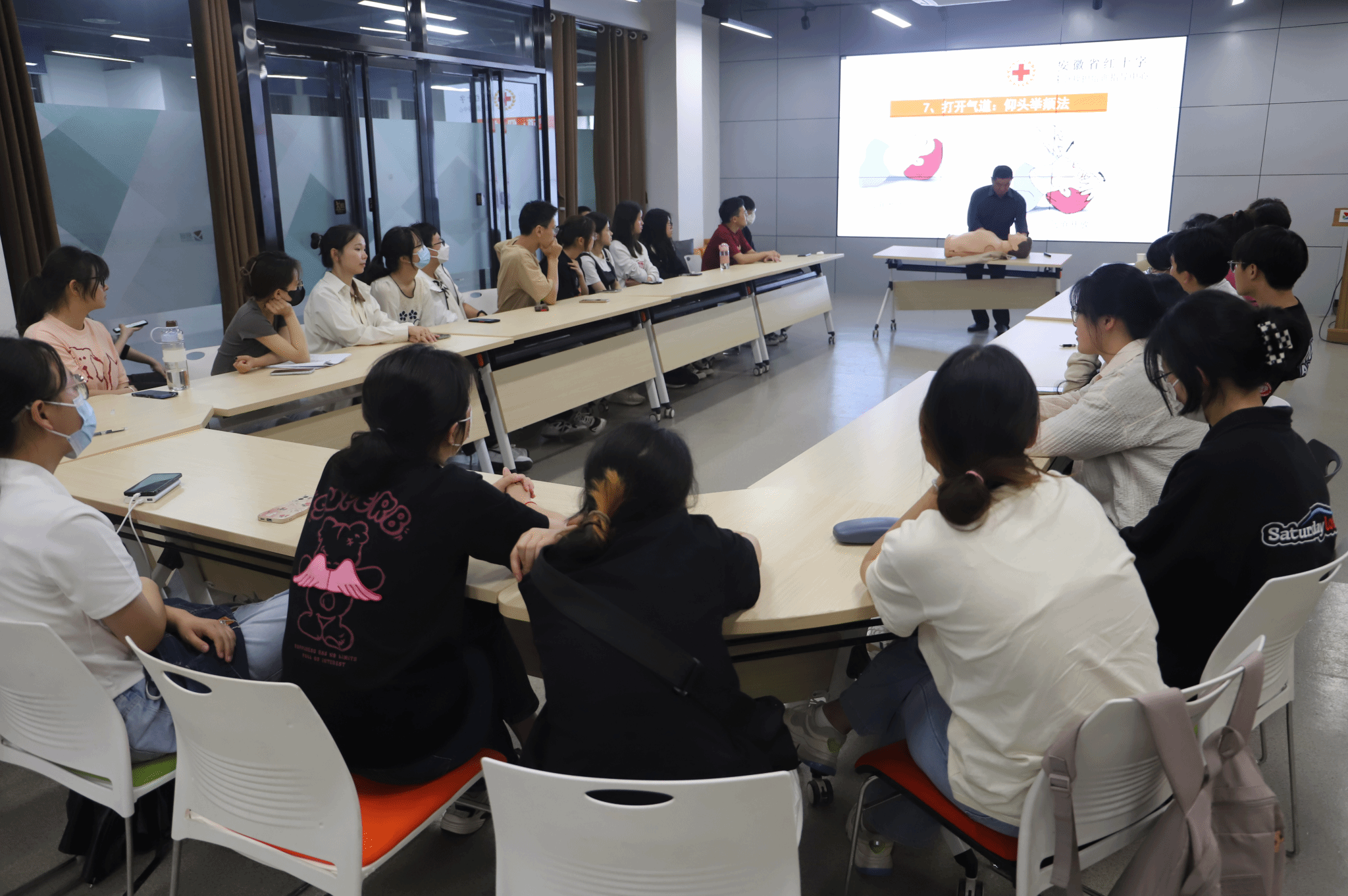 何立新作为安徽省健康服务业协会公共急救分会第一届委员会常务委员、安徽省红十字会培训中心授课教师有着非常丰富的急救经验。本次授课主要围绕心脏骤停、食道异物堵塞、中暑、烧伤、烫伤等情景讲授相关急救知识,重点讲授徒手心肺复苏的全过程及操作要领,急救过程中如何清理口腔异物,人工呼吸、胸外按压等急救规范动作,现场利用人体模型进行模拟急救实操。何老师还与同学们深入互动,让同学们上台进行徒手心肺复苏“实战”演练,从环境评估到胸外按压再到人工呼吸,何老师在旁边细心指正,严格按照标淮步骤与动作,让同学们切实掌握实操技能。活动结束后,同学们纷纷留言认为本次活动授课专业,讲解生动,切身体会到了生命的可贵,学到了很多急救知识。