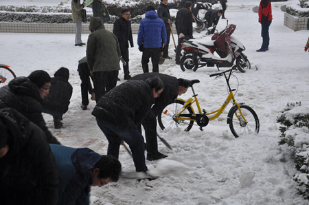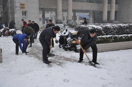 在学院党政领导刘凯、张晓伟、谈应权的带领下,教代会代表利用实验室的铁锹等工具,在十教周围主要道路进行除雪,方便师生通行,及时降低和消除道路湿滑安全隐患。