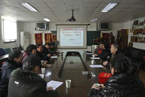 本网讯1月31日下午,理学院召开2017年度首届“师德标兵”表彰会,学院党政领导张俊武、毕守东、张袖丽、韩弥明及受表彰的六位老师参加了会议,会议由院党委书记张俊武主持。