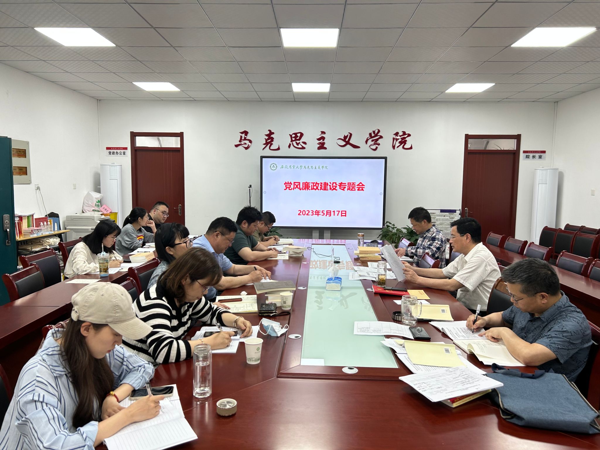 又讯:5月17日,马克思主义学院召开党风廉政建设专题会,党委副书记、纪委书记、副院长袁修雨主持会议。党委书记孙超,纪委委员、党支部书记参加会议。袁修雨领学了《习近平关于党风廉政建设和反腐败斗争论述摘编》《习近平关于严明党的纪律和规矩论述摘编》部分篇目内容,用近期上级部门通报的典型案例以及身边人身边事开展警示教育。对于学院外出培训研学、党员纪律意识、课堂纪律、科研诚信和财务管理等方面提出了具体要求。(作者:费强 一审:桂中婷 二审:孙超 三审:吴渭)