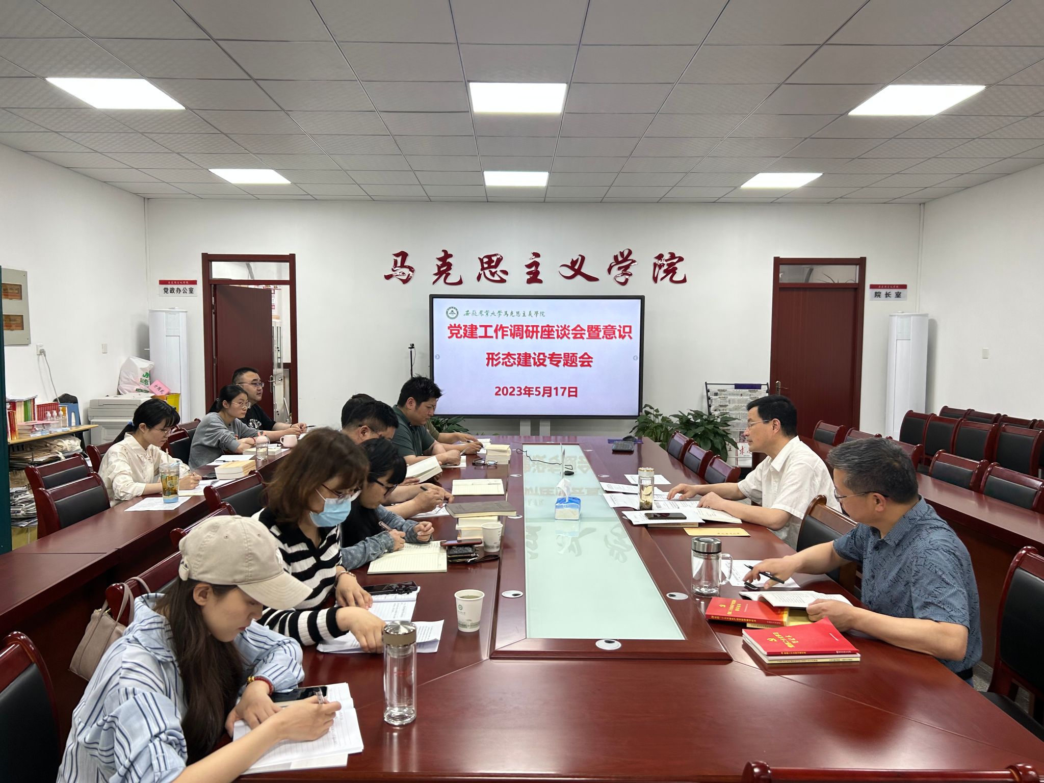 本网讯 5月17日下午,马克思主义学院党委在人文楼302会议室召开党的建设调研座谈会暨意识形态建设专题会,党委书记孙超主持会议。党委副书记、纪委书记、副院长袁修雨,各党支部书记、教研部(中心)主任参加会议。