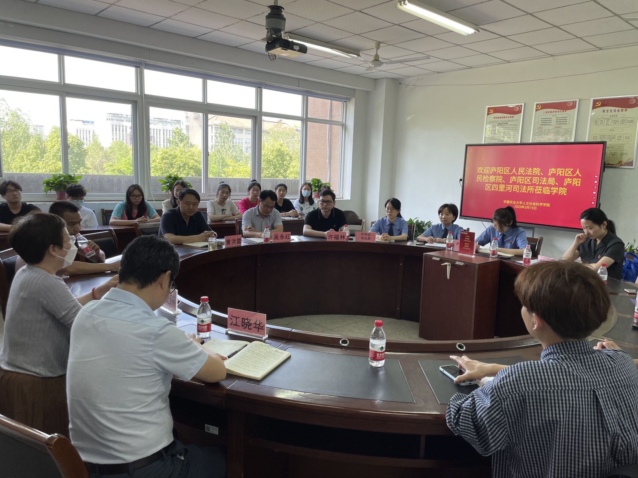 座谈会上,黄洪雷对庐阳区相关部门来校开展普法宣传活动表示热烈欢迎,并详细介绍了学校、学院发展历史、人才培养、科学研究、社会服务、文化传承与创新等基本情况,希望校地双方为法学、应用心理学等专业人才培养、实习实践搭建平台,加强合作。庐阳区司法局副局长许福林、人民检察院和法院负责人详细介绍了部门工作业务和职责,并结合自身成长经历勉励与会学生代表强化专业学习目标,树立明确的职责生涯目标,切实用行动为实现中华民族伟大复兴而不懈奋斗。