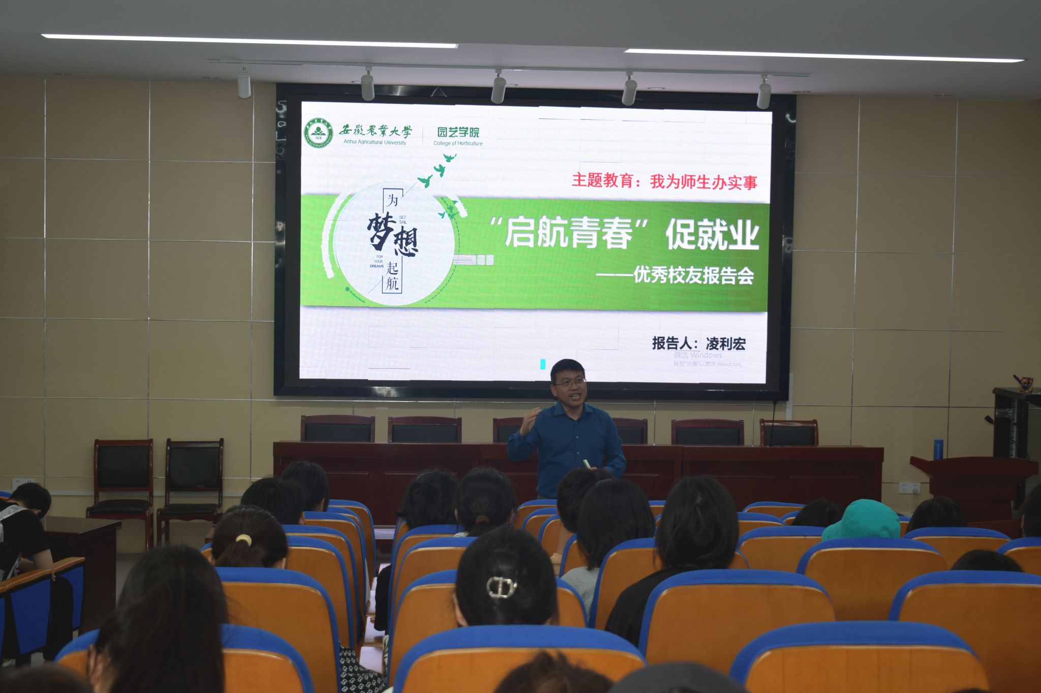 本网讯 为进一步加强校友与学院的交流合作,积极发挥优秀校友榜样引领作用,拓宽学院访企拓岗途径,5月22日,园艺学院邀请了安徽省大地园林股份有限公司董事长凌利宏来院开展“启航青春”促就业优秀校友报告会。