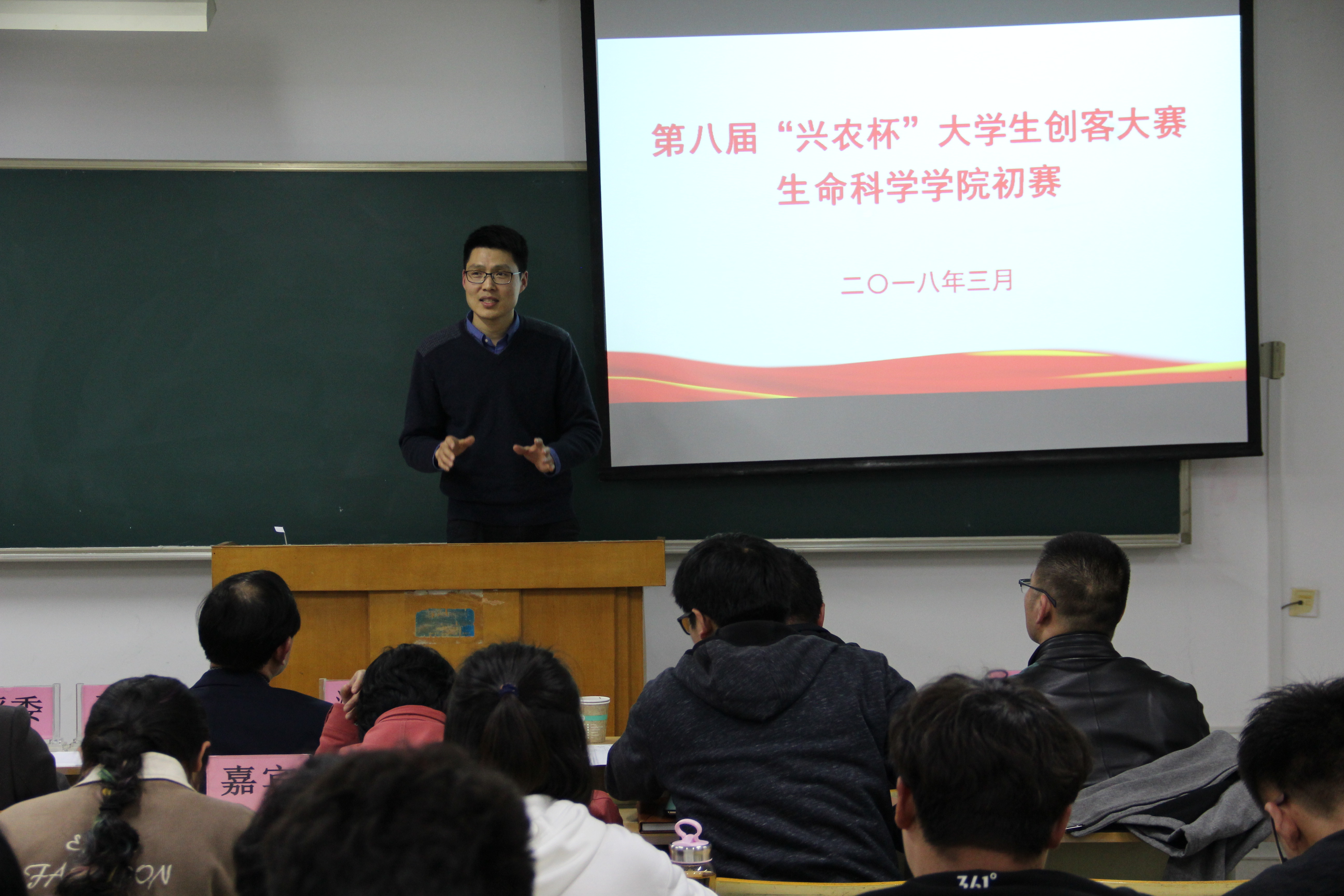 本网讯3月15日晚,生命科学学院在九教312教室举办第八届“兴农杯”大学生创客大赛初赛。学院常务副院长蔡永萍、党委副书记兼副院长吴国卿出席大赛。校团委书记张健、生物制药系主任汪维云、生物科学系主任王云生及相关老师应邀担任比赛评委。