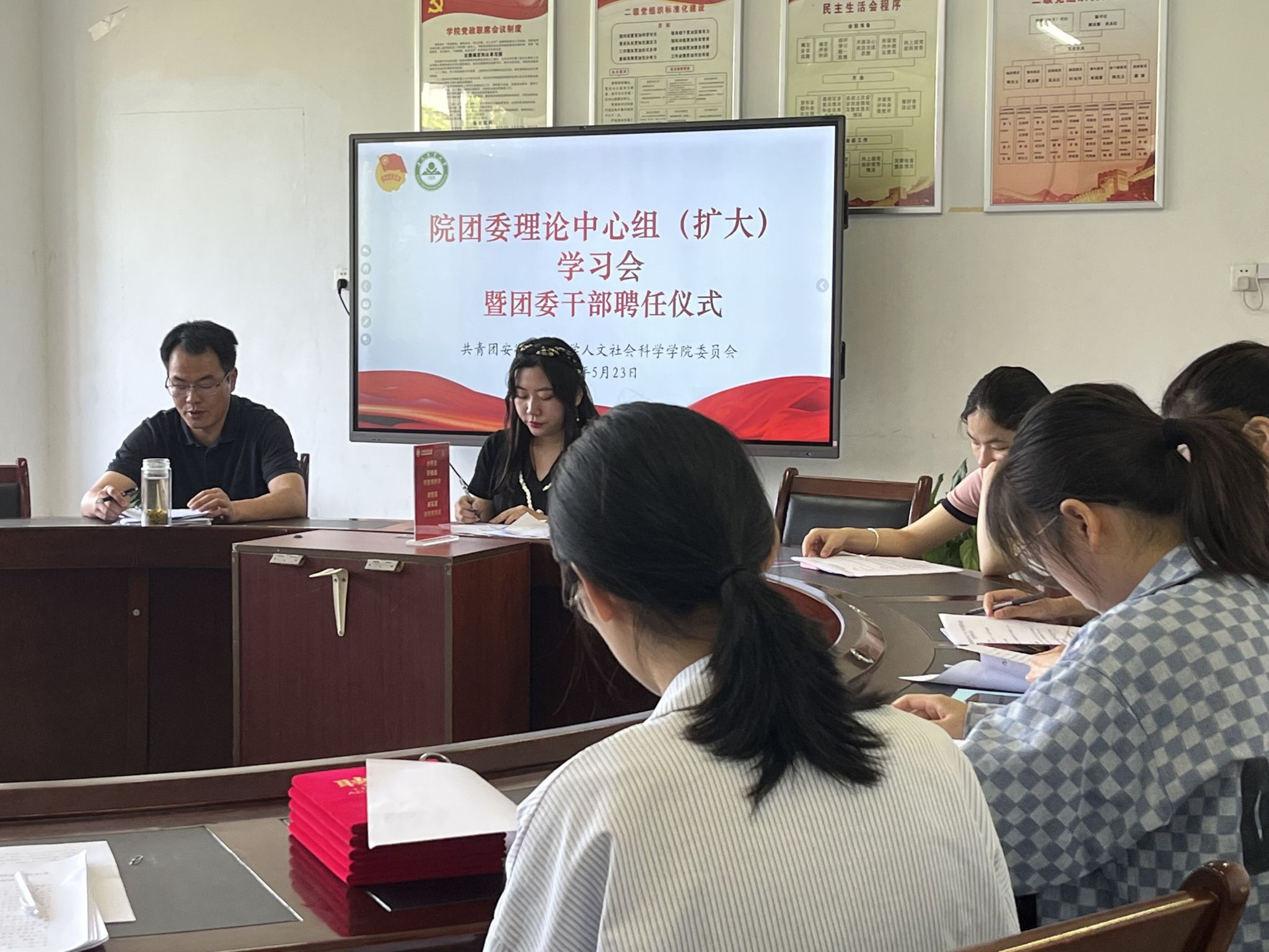 本网讯 5月23日中午,人文社会科学学院在人文楼204会议室召开团委理论中心组(扩大)学习会暨学院团委干部聘任仪式。院党委副书记吴永红、院团委干部、毕业班团支书参加本次会议。会议由院团委负责人主持。