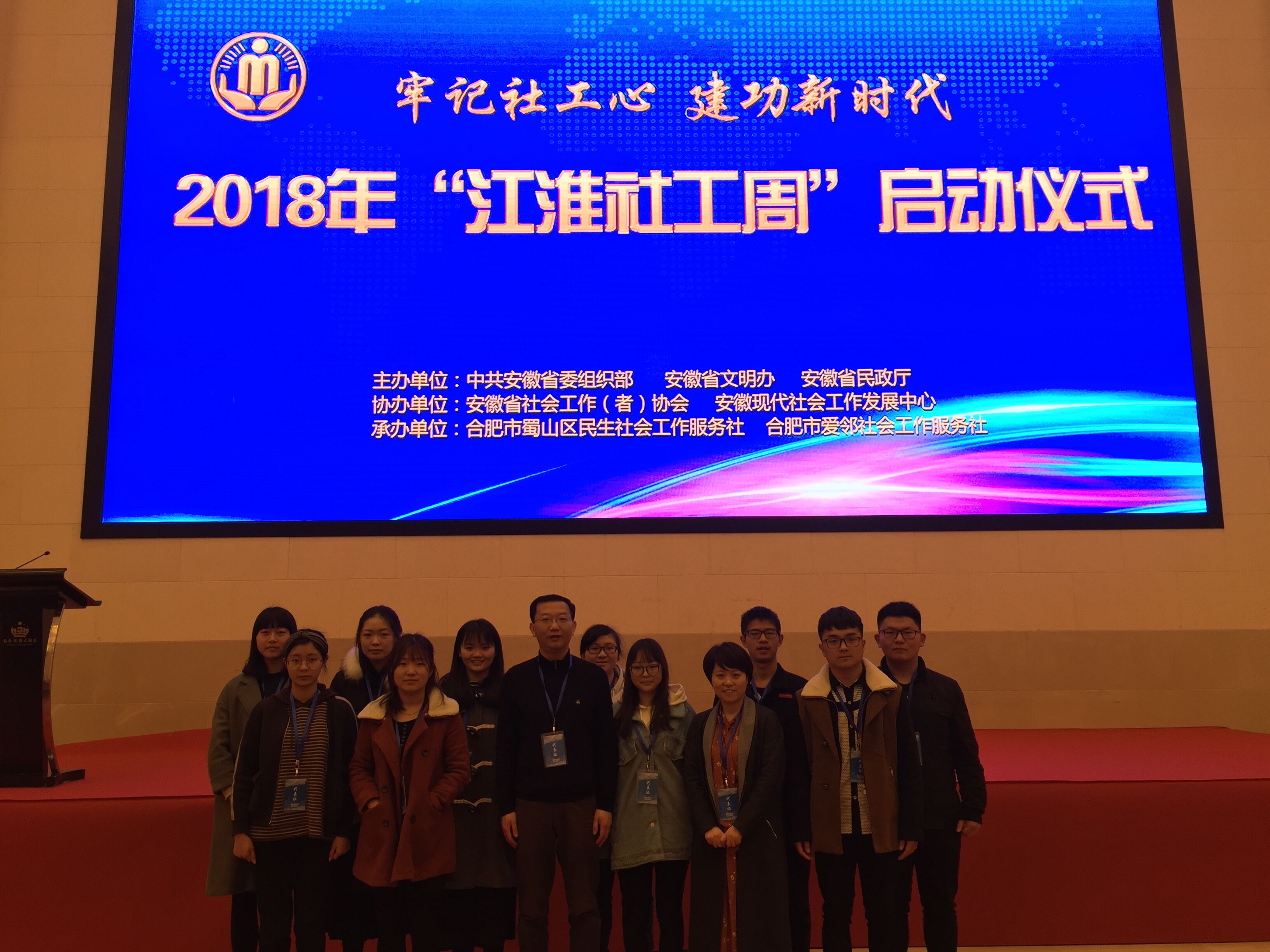 本网讯 3月20日上午,由安徽省委组织部、省文明办、省民政厅联合主办的2018年“江淮社工周”宣传活动在合肥启动,人文社会科学学院师生代表应邀参会。