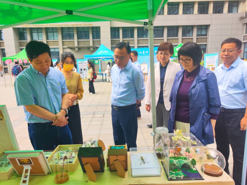 本网讯 5月31日,植物保护学院在中西部综合楼门前广场举办首届植保文化节闭幕式。校党委副书记裴树东,校党委常委、副校长操海群,学工部(处)处长姚莉,校团委副书记武晓蓓,学院领导班子到闭幕式现场参展。