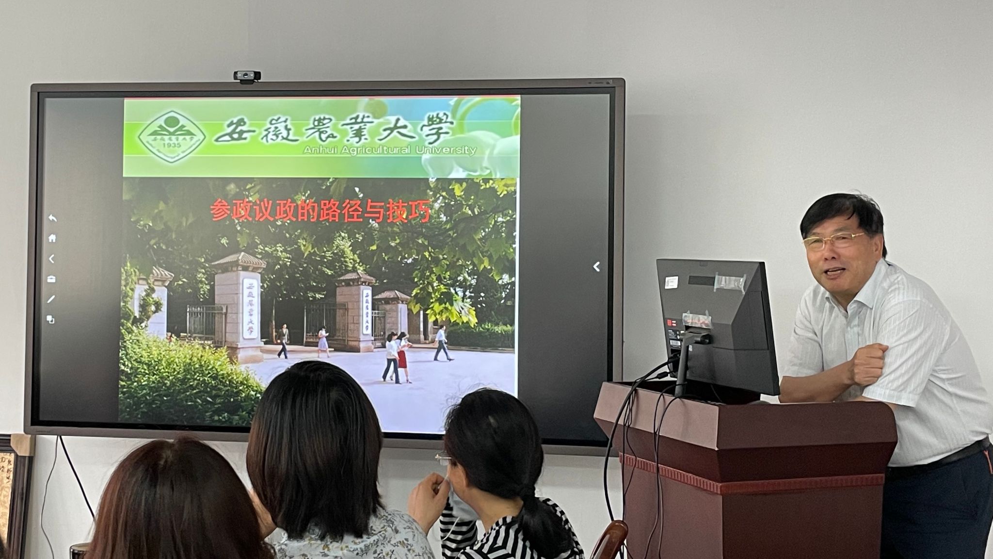 会议邀请省政府参事於忠祥教授做《参政议政的路径与技巧》专题讲座。於忠祥结合自己多年来参政议政的理论思考和实践成果,分享了参政议政的工作方法和经验。参政议政是民主党派的中心工作,是履行参政党职能的重要内容,要瞄准“国之大者,皖之大计,民之期盼”开展参政议政工作,牢牢把握选题、调研和行文三个环节。他强调,要紧紧围绕中心服务大局,发挥民革安农大总支的专业优势,积极建言献策,为推动安徽经济社会高质量发展贡献力量。