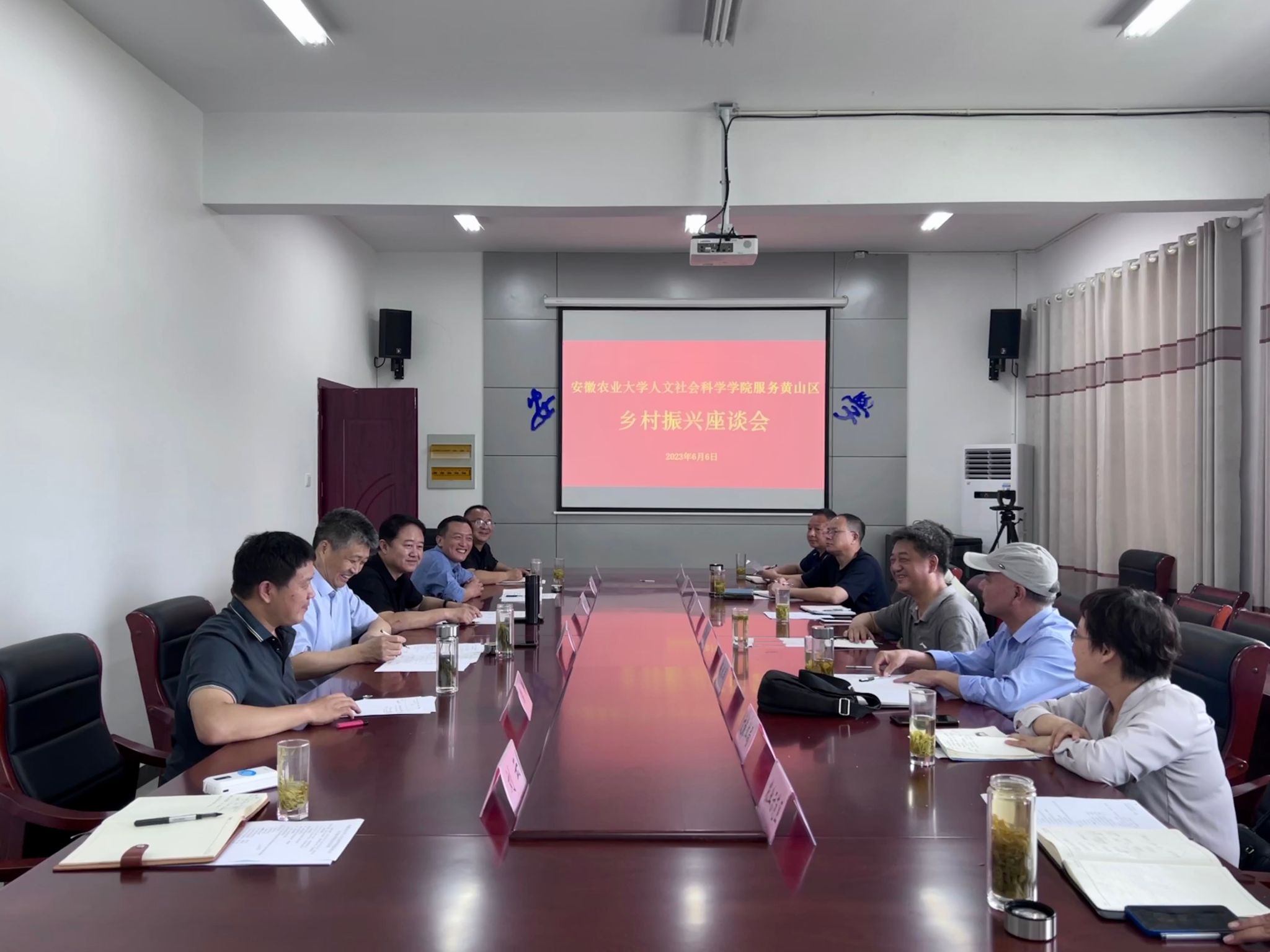 座谈交流促分享,深化共识谋合作。会上,苏俊颖对人文社会科学学院一行的到来表示欢迎,并对黄山区产业发展、乡村振兴、乡村治理等情况及取得的成绩进行了详细介绍,希望与人文社会科学学院在服务黄山区乡村文化振兴、社区矫正、普法宣传等方面开展合作,为当地乡村振兴注入精神动力和文化力量。黄洪雷介绍了学院发展概况、办学特色、人才培养、社会服务等方面的情况,他指出,学院坚持把服务乡村振兴战略放在学院发展的优先位置,勇担乡村振兴使命,积极探索服务乡村振兴战略的有效路径,并表示希望与黄山区加强交流合作,通过筹建人文“科技小院”,立足地方特色资源禀赋的优势,开展产学研合作,实现优势互补,合作共赢。陈先玉在会上指出,黄山区区位优势明显,产业资源丰富,文化底蕴深厚,具有广阔的合作空间,希望与黄山区各单位能加强沟通对接,寻找合作契合点,创新合作模式。