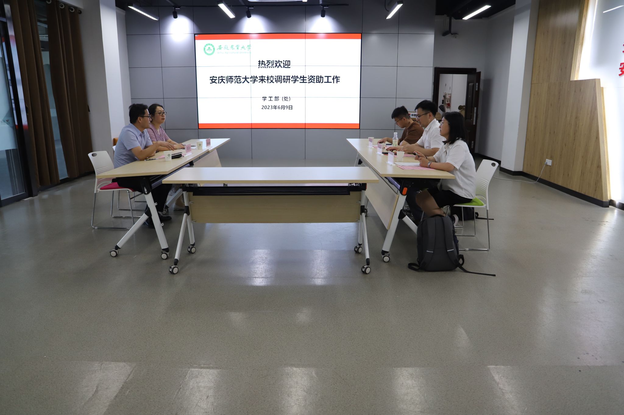 本网讯 6月9日下午,安庆师范大学学生处副处长方瑞一行到我校调研学生资助工作,学生处副处长、学生资助管理中心主任周涛在易班发展中心接待来访并主持座谈会。