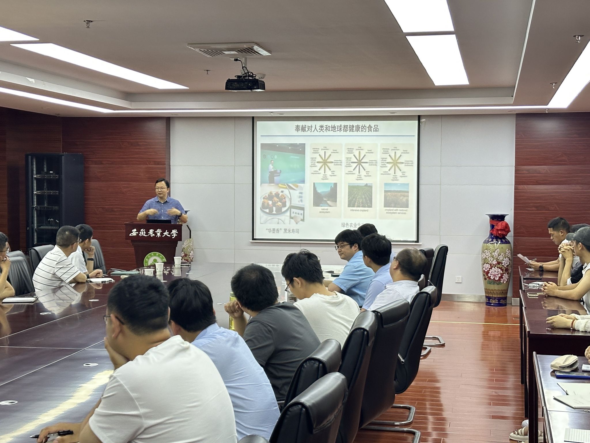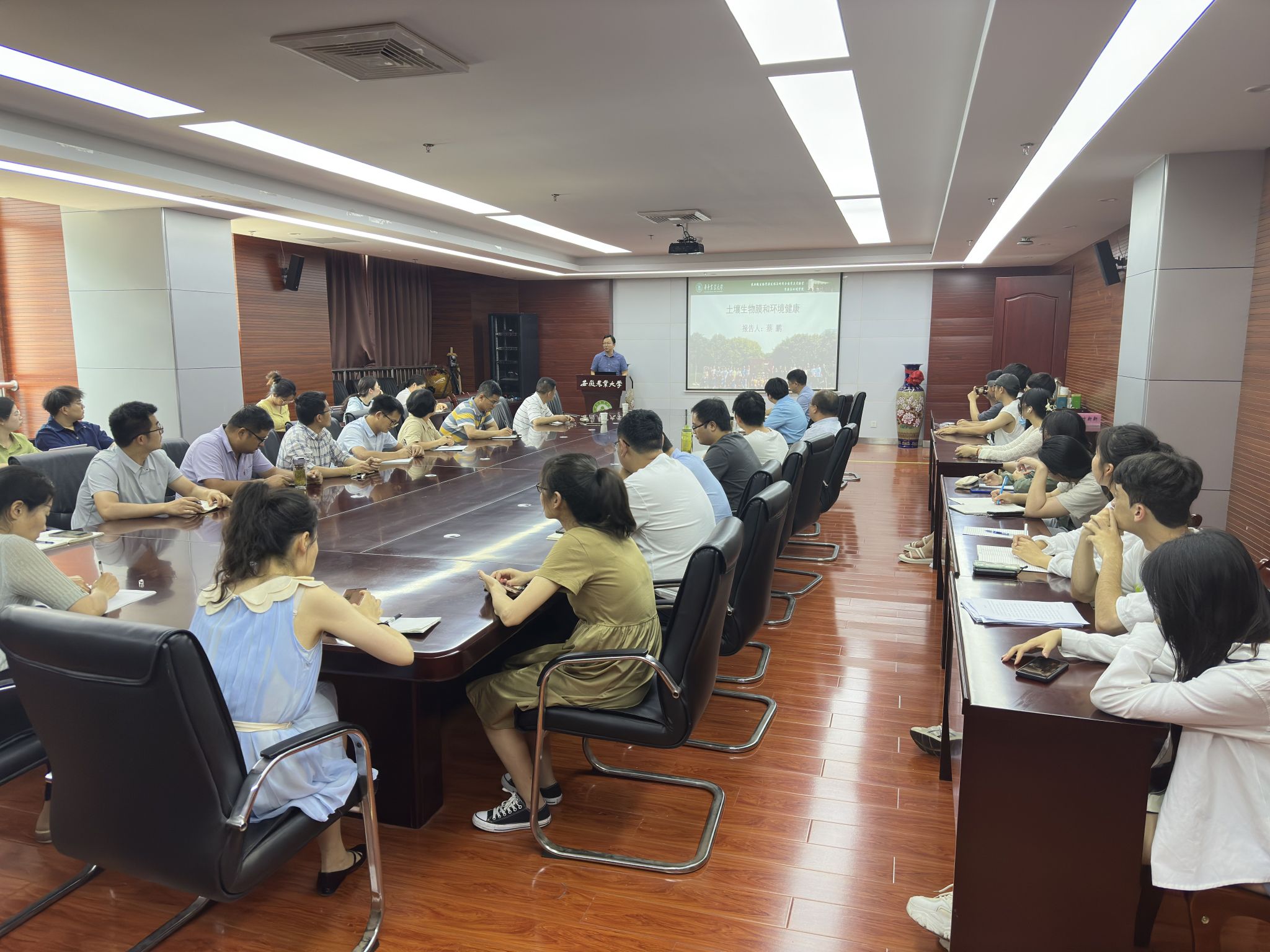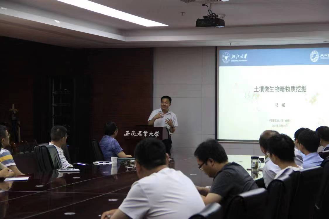 本网讯 6月21日下午,资源与环境学院于中西部综合楼南楼510会议室举行“绿洲”生态环境高峰论坛学术报告会,特邀华中农业大学资源与环境学院蔡鹏教授和浙江大学土水资源与环境研究所马斌研究员分别作题为“土壤生物膜与环境健康”和“土壤微生物暗物质挖掘”的学术报告。学院60余名师生参加了报告会,会议由学院院长吴祥为教授主持。