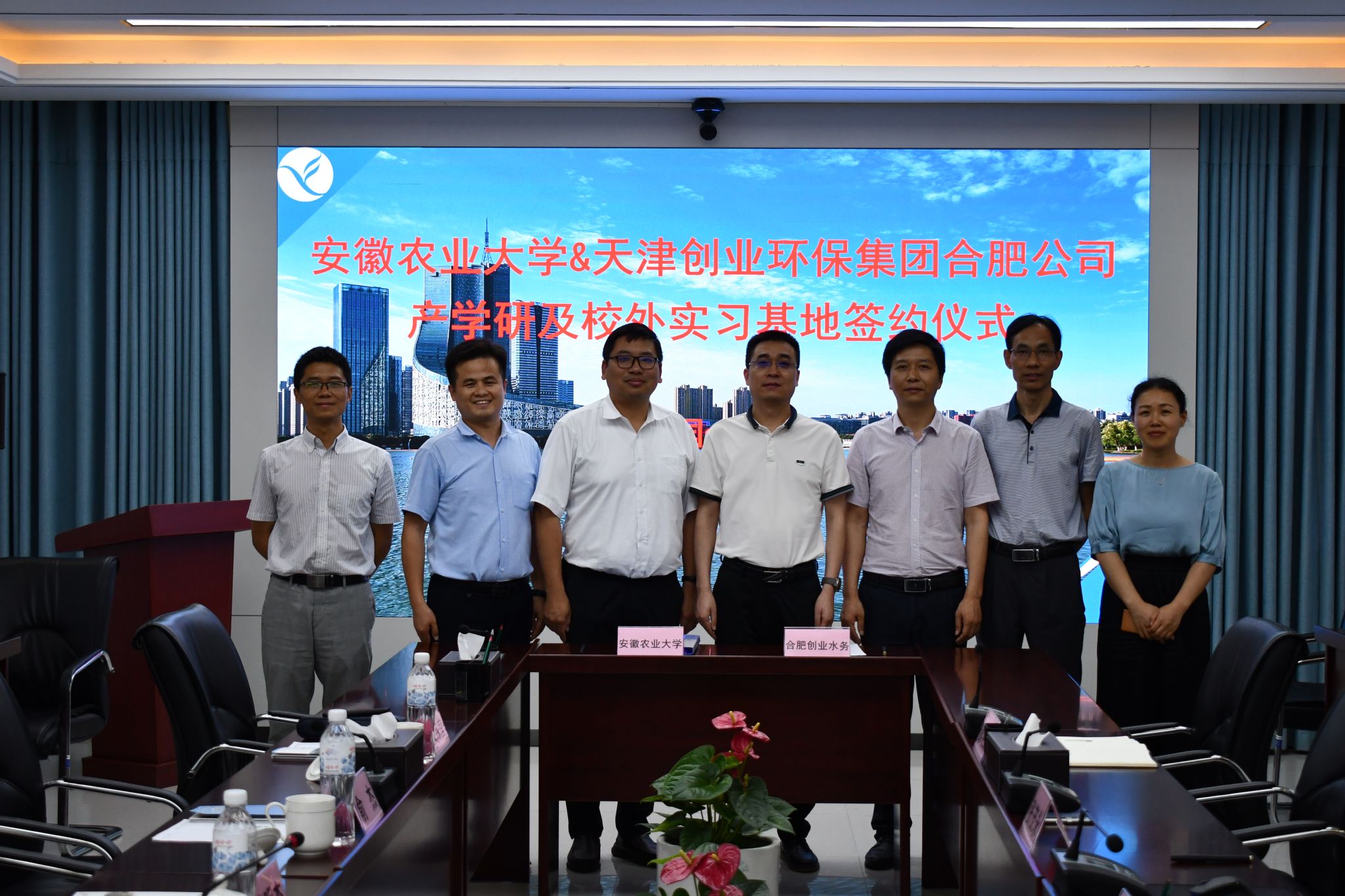 本网讯 为进一步加强校企合作,创新人才培养模式,6月20日下午,安徽农业大学理学院院长俞杰、副院长张成堂一行赴天津创业环保集团合肥公司(合肥创业水务有限公司)进行调研并签订产学研及校外实习基地合作协议。合肥创业水务有限公司总经理张茂永、总经理助理杨俊超等人参加了签约仪式。