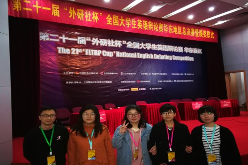 本网讯 4月5日至7日,由团中央学校部、全国学联、外语教学与研究出版社主办的第二十一届“外研社杯”全国大学生英语辩论赛华东区决赛在南京师范大学落下帷幕,来自上海、江苏、浙江、山东、安徽五省市,包括浙江大学、复旦大学、上海交通大学、上海外国语大学等109所高校代表队参加了本次大赛。经过3天5轮的激烈角逐,最终喜获三等奖。