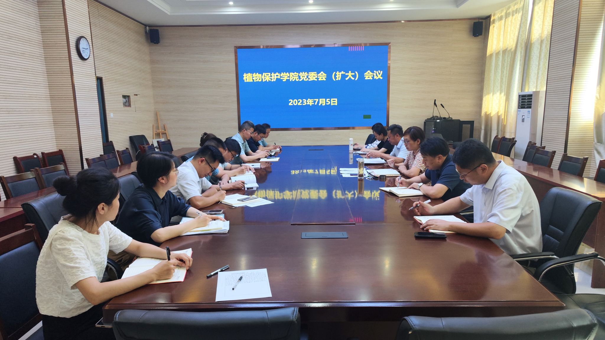 本网讯 7月5日下午,植物保护学院党委书记刘柳主持召开党委扩大会,专题学习省委书记韩俊同志来校调研讲话精神和校党委常委(扩大)会议精神。院领导潘月敏、汪小强、唐庆峰、张华建,院党委委员,各支部书记、副书记,系主任、副主任,党政办全体工作人员参加会议。