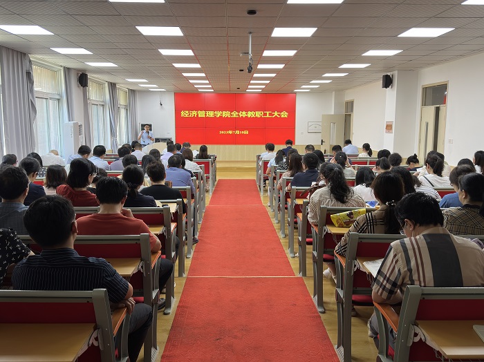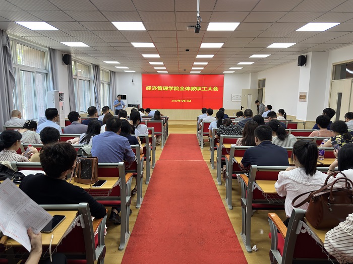 本网讯 7月10日下午,经济管理学院全体教职工大会在经管楼103报告厅召开。学院班子成员、全体教职工参会。会议由学院党委副书记吴国卿主持。