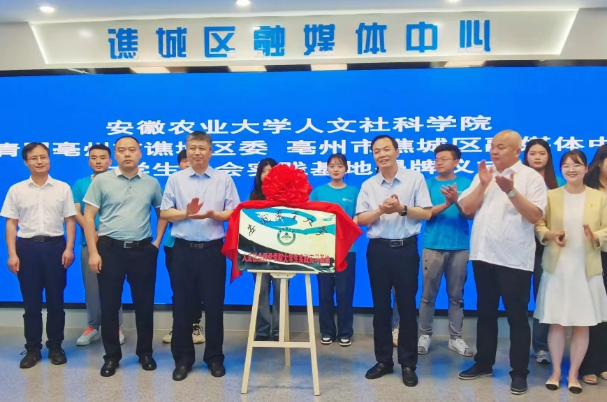 本网讯 为持续深化校地共建实习实践育人合作平台,助力青年学子提升社会实践能力和创新精神。7月17日上午,人文社会科学学院与谯城区融媒体中心举行“双向赋能,共育英才”青年人才谯城行座谈会暨大学生社会实践基地签约揭牌仪式,谯城区委常委、宣传部部长、区总工会主席韩劲夫,区委宣传部副部长阮涛,区人社局、团区委、融媒体中心、人才办、华佗镇、亳州青年创客空间等单位负责人,学院党委书记陈先玉、副院长单国雷、党委委员叶良均和部分参加“三下乡”社会实践学生代表出席签约揭牌仪式。