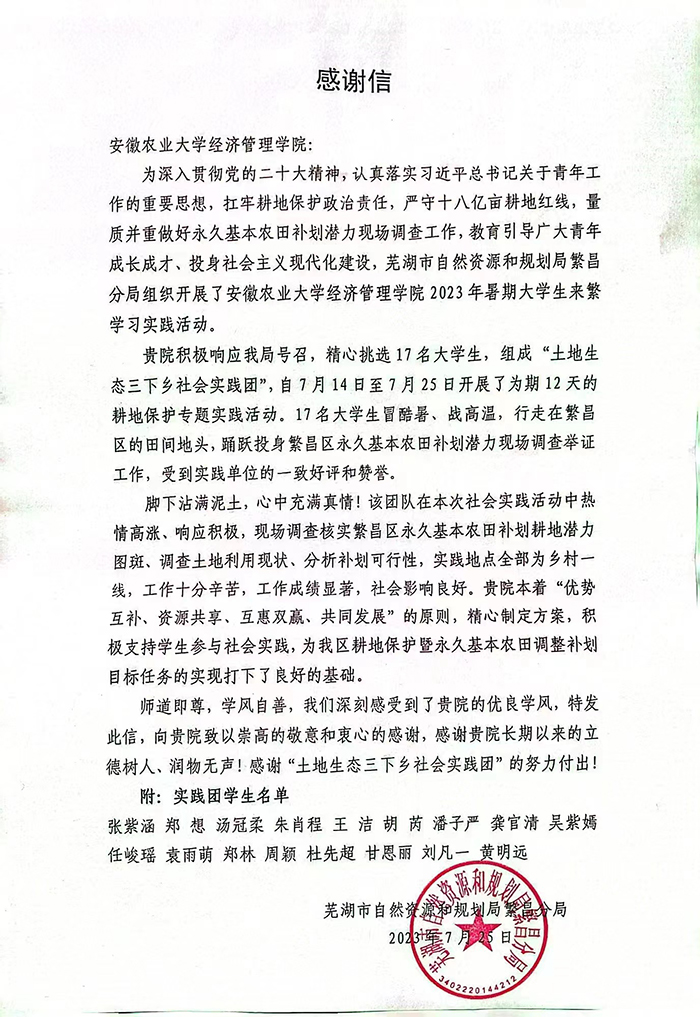 近日,一封来自芜湖市自然资源和规划局繁昌分局的感谢信送达经济管理学院,热切表达了对学校、学院以及学院“土地生态三下乡社会实践团”17名成员在芜湖市繁昌县辛勤付出的肯定和感谢。