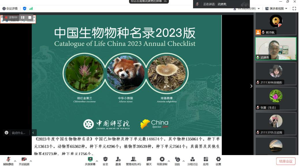 在8月17日的专题讲座中,生态环境部南京环境科学研究所武建勇研究员从生物多样性的层次和基本概念、中国生物多样性的现状和利用、中国生物多样性面临的威胁、生物多样性保护成效和展望等四个方面为学院生态学、环境科学等学科专业50余名师生作了系统讲授。