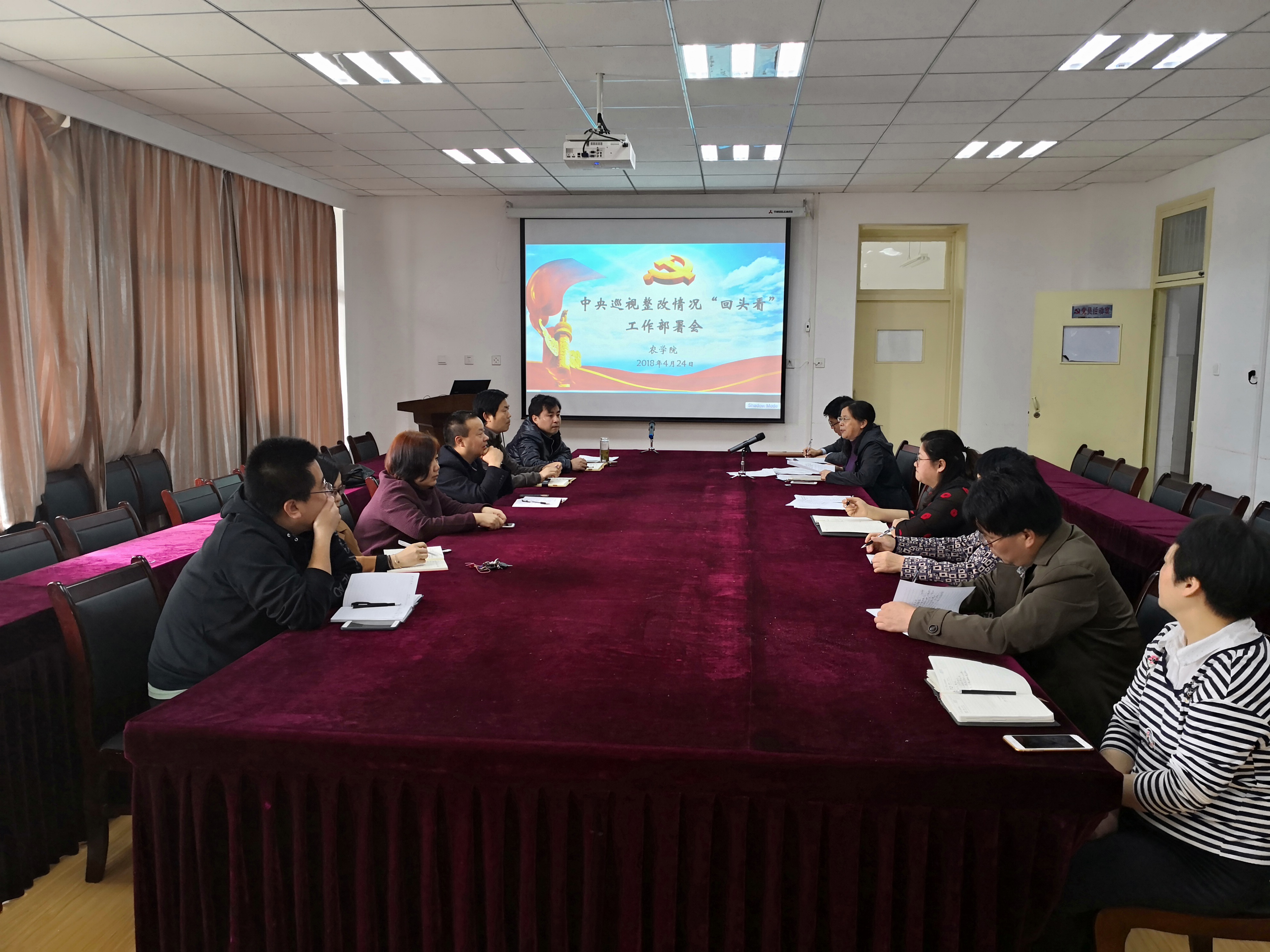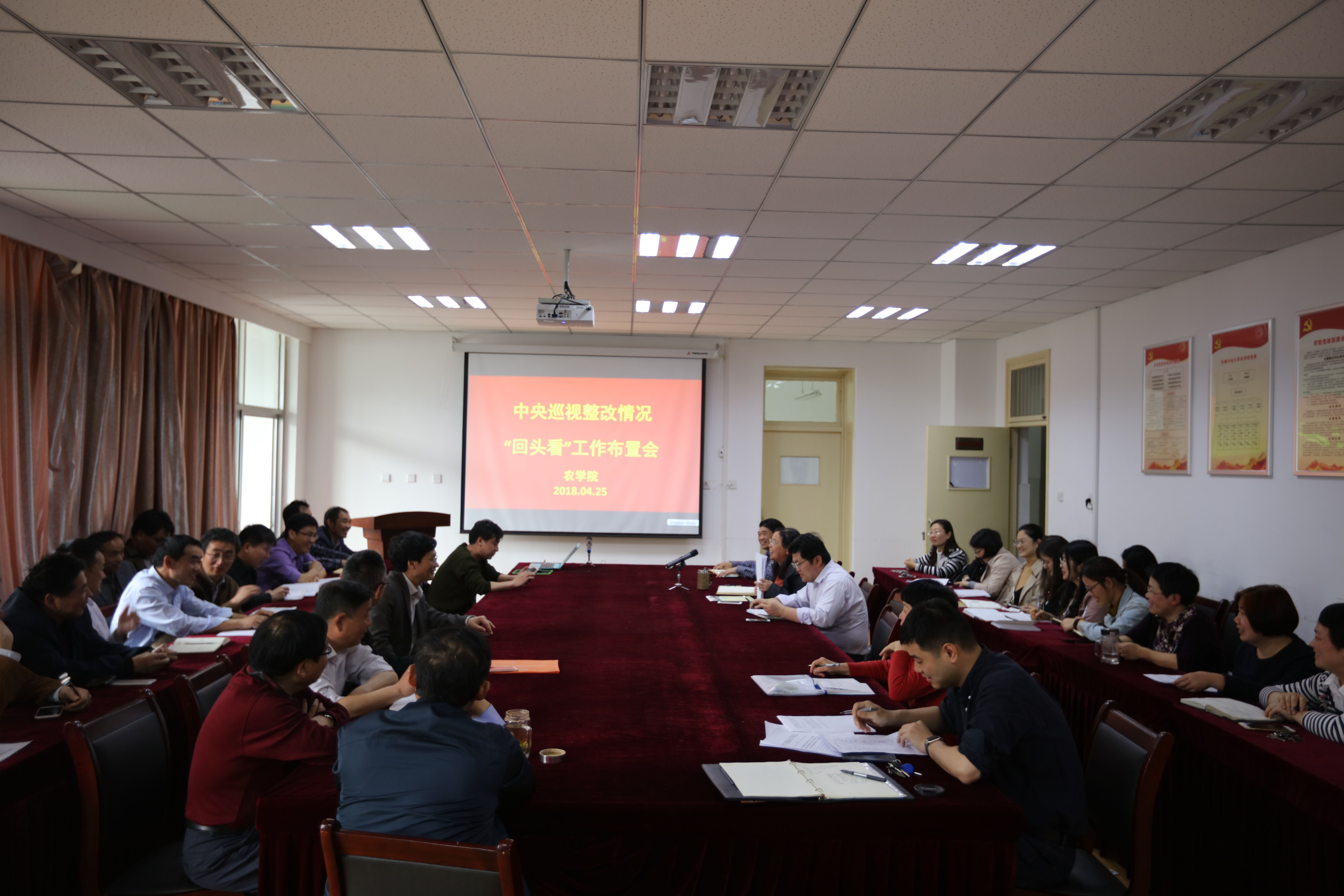 4月24日、25日,农学院分别召开院党委会、全体教职工会,部署以“查漏洞、抓反弹、补短板”为主要内容的中央巡视整改情况“回头看”工作会。 会上,汪凤莲宣读了《关于在全校范围开展以“查漏洞、抓反弹、补短板”为主要内容的中央巡视整改情况“回头看”实施方案》的通知,落实排查整治工作。