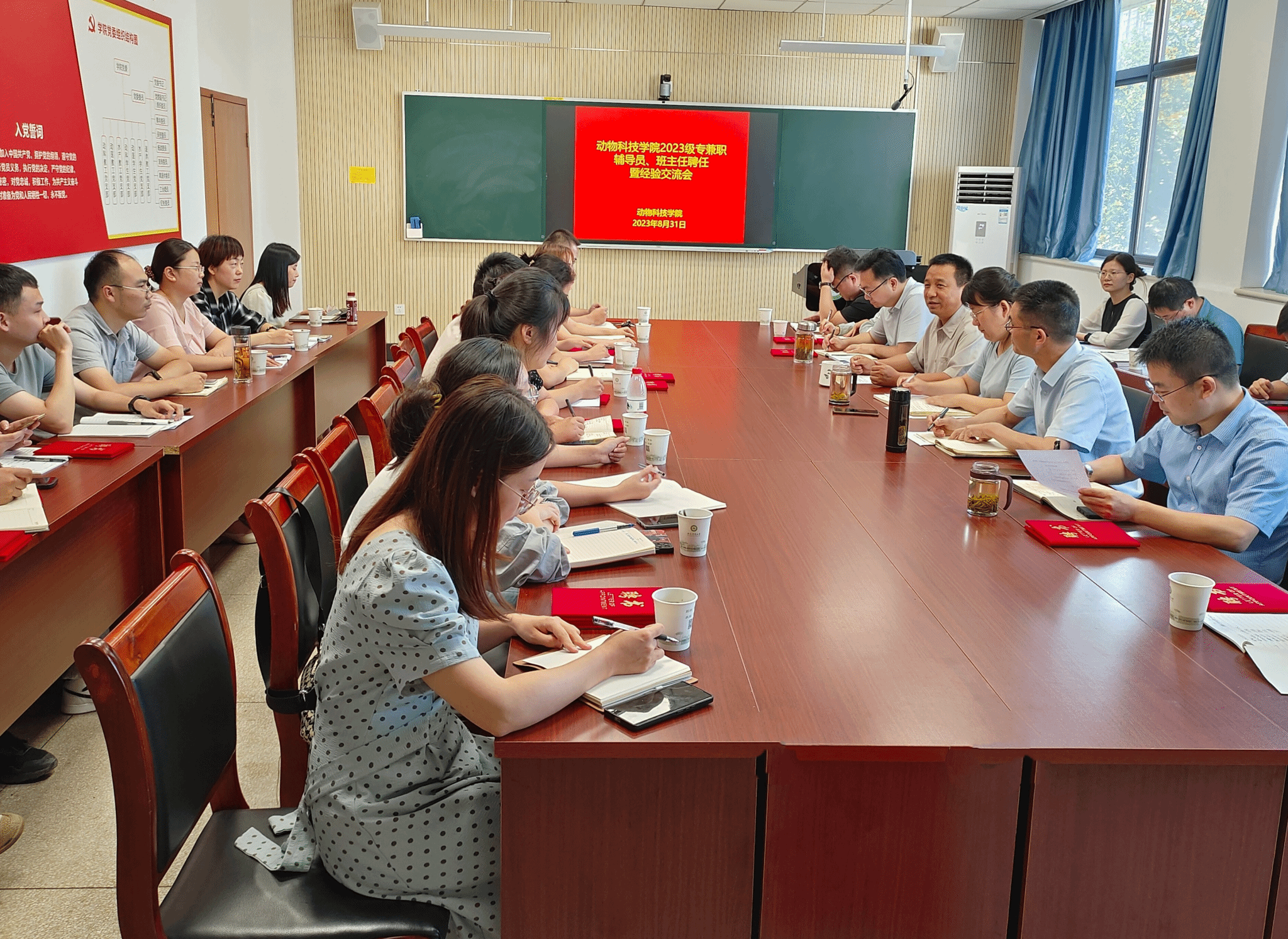 本网讯 8月31日下午,动物科技学院在306会议室召开2023级新生专兼职辅导员、班主任聘任暨培训交流会。学院党委副书记(主持工作)沈兆梅,院长张子军,副院长涂健、凌英会及全体专兼职辅导员、班主任参加。会议由党委副书记章巍主持。