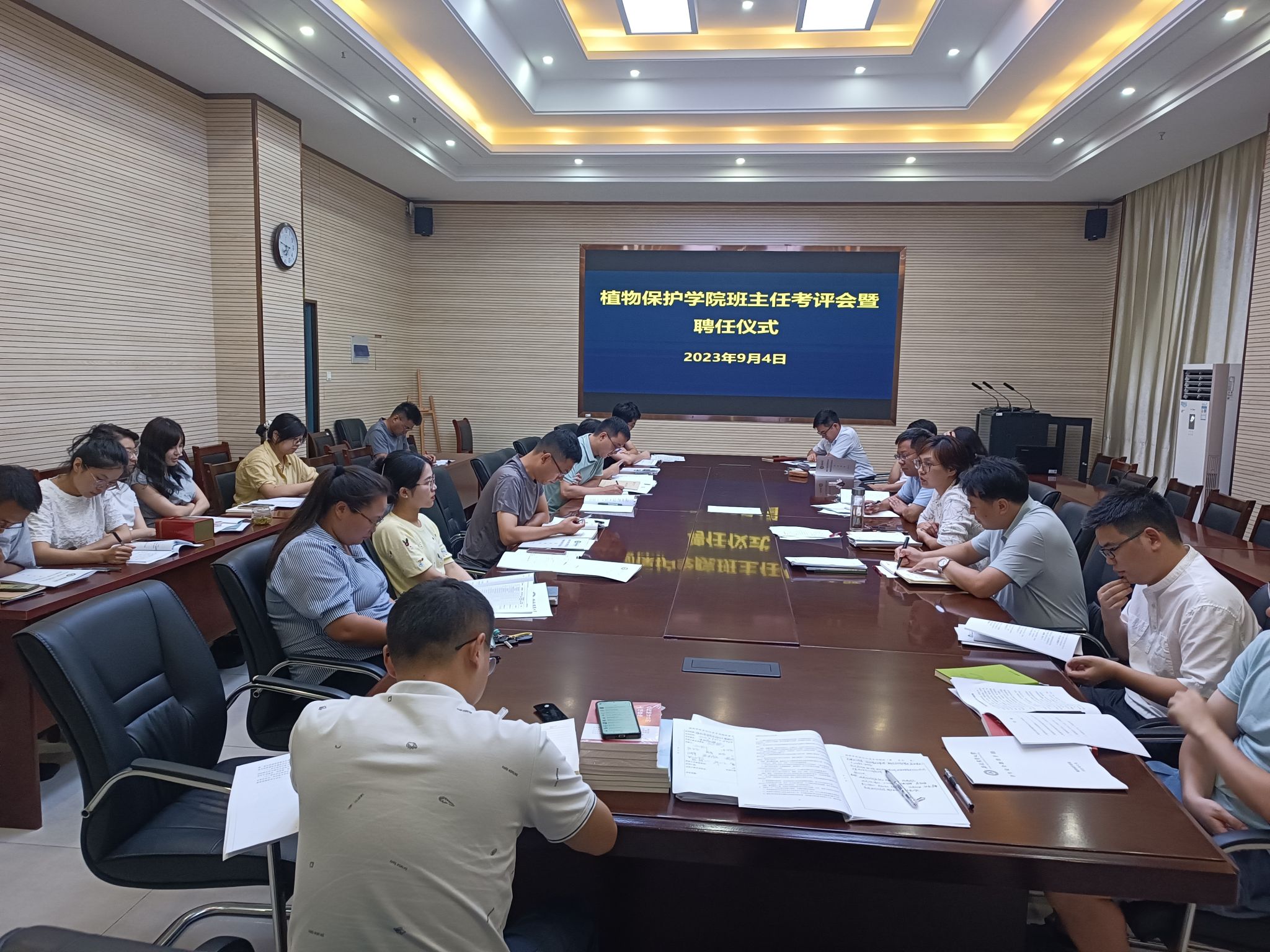 本网讯 9月4日下午,植物保护学院在中西部综合楼1213会议室举办2023年班主任考评会暨聘任仪式。学院党委书记刘柳、院长潘月敏,学院全体辅导员、班主任参加会议。会议由学院党委副书记汪小强主持。