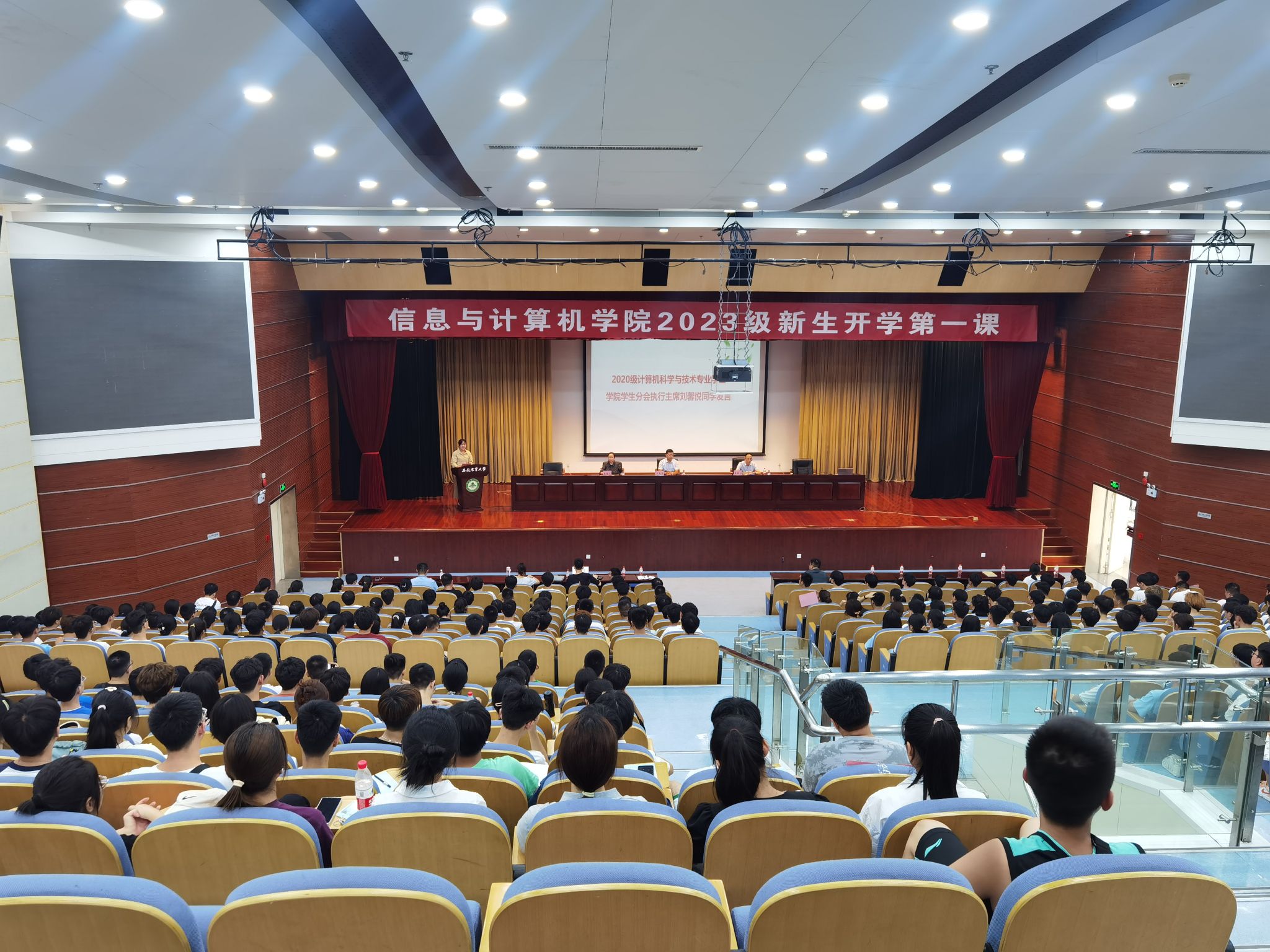 本网讯 9月7日上午,信息与计算机学院2023级本科生开学第一课在图书馆一号报告厅举行。学院党政领导、教师代表、新生辅导员及2023级428名新生参加了此次会议。会议由学院党委副书记、纪委书记李南飞主持。