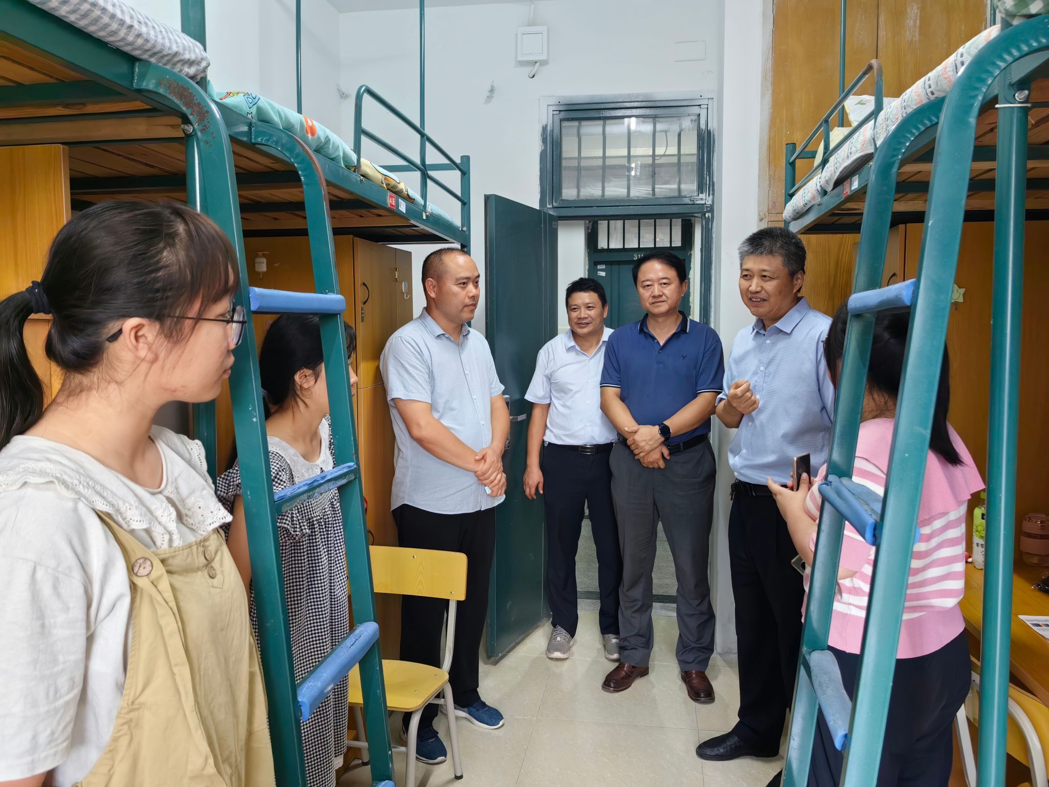 当天下午,学院领导与新生辅导员走进新生宿舍,详细了解新生住宿和生活情况。“你们从哪里来?”“学校宿舍环境怎么样?饮食习惯吗?”走访过程中,学院领导与同学们聊家常、说兴趣、谈规划,嘱托新生要相互关心,相互帮助,尽快调整好状态、适应大学新环境,做好军训准备,以良好的状态迎接大学生活。