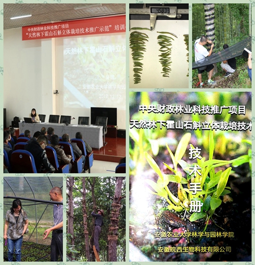 本网讯由我校傅松玲教授为项目负责人主持并推广实施的2017年中央财政林业推广示范项目“天然林下霍山石斛立体栽培技术推广示范”进展顺利,已完成年度建设任务。该项目总投资125万元,实施年度为2017至2019年,目前累计投入100.52万元,已完成50亩霍山石斛天然林内立体栽培基地建设任务,林内活树附生及林隙地仿野生栽植16万丛;建成灌溉系统1套;举办技术培训班1期,60人余次参加培训;编发技术手册100余册;发表学术论文1篇、培养研究生1名。