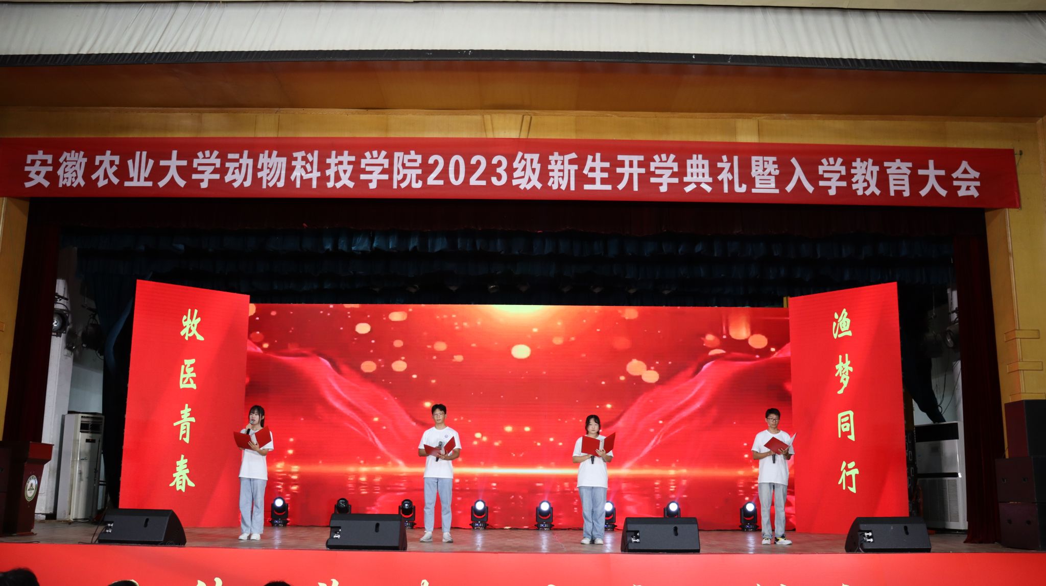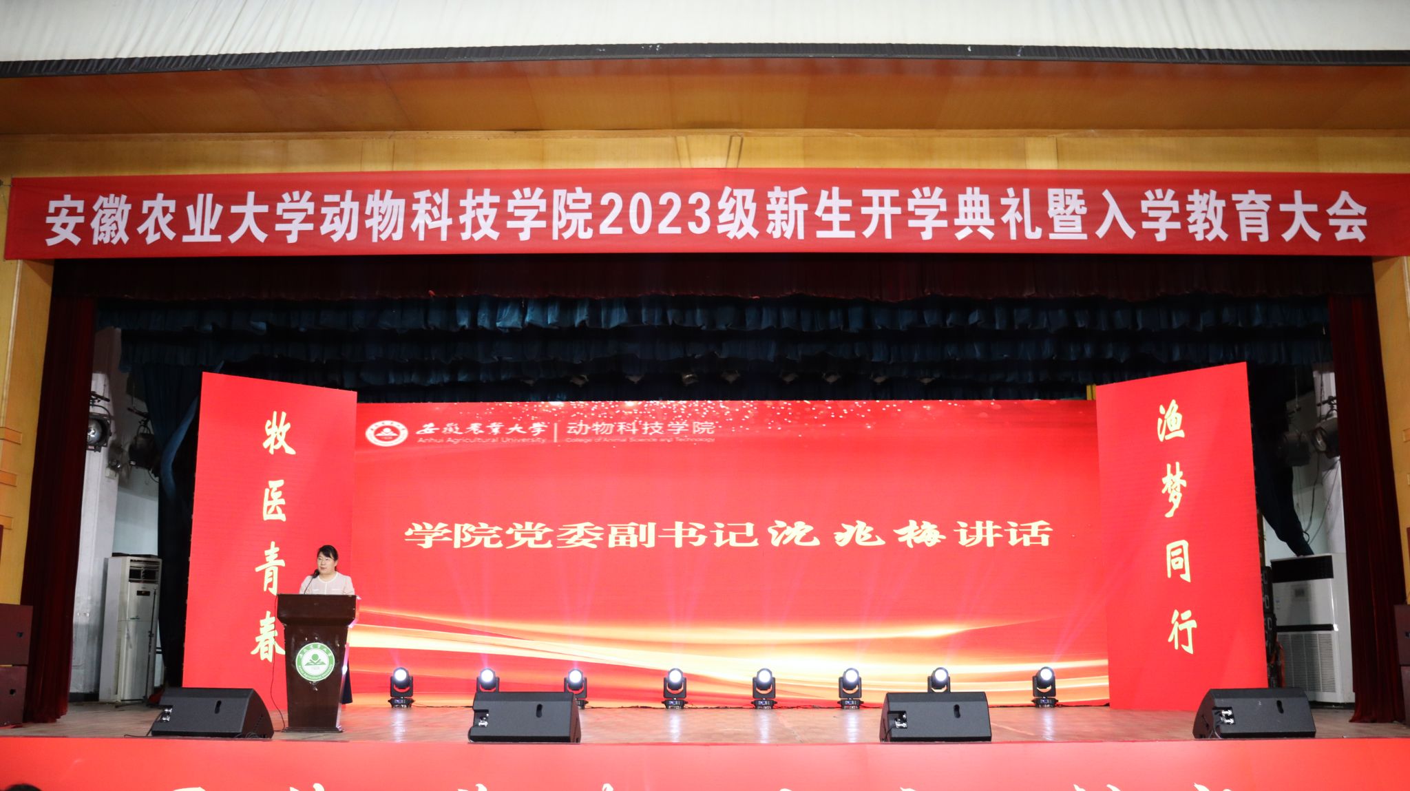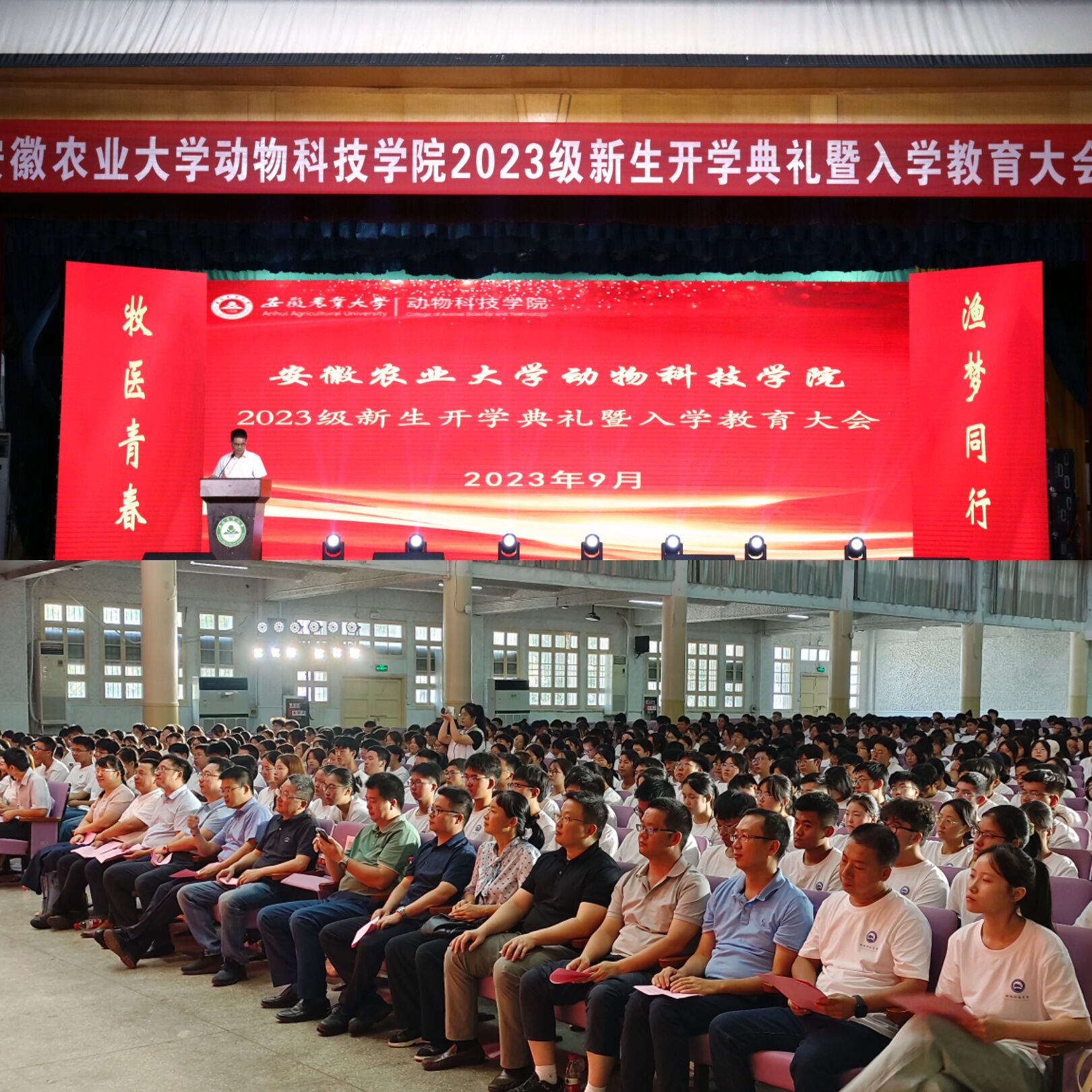 本网讯 金秋送爽,丹桂飘香。9月9日上午,动物科技学院2023级新生开学典礼暨入学教育大会在校大礼堂隆重举行。学院党委副书记(主持工作)沈兆梅,院长张子军,副院长涂健、凌英会,杰出校友、中国科学技术大学基础医学院李丰银教授,各系主任、副主任,教师代表,新生辅导员、班主任出席本次典礼。来自全国各地的600多名2023级新生参加了典礼。典礼由学院党委副书记章巍主持。