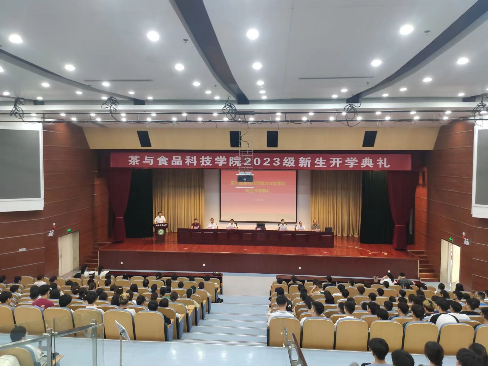 本网讯 9月8日上午,茶与食品科技学院2023年开学典礼隆重举行,来自五湖四海的260余名新生齐聚校图书馆第一报告厅,开启人生新旅程。院长李大祥、党委副书记沈周高、国家重点实验室常务副主任韦朝领、各系主任、青年教师代表以及2023级新生辅导员出席典礼。