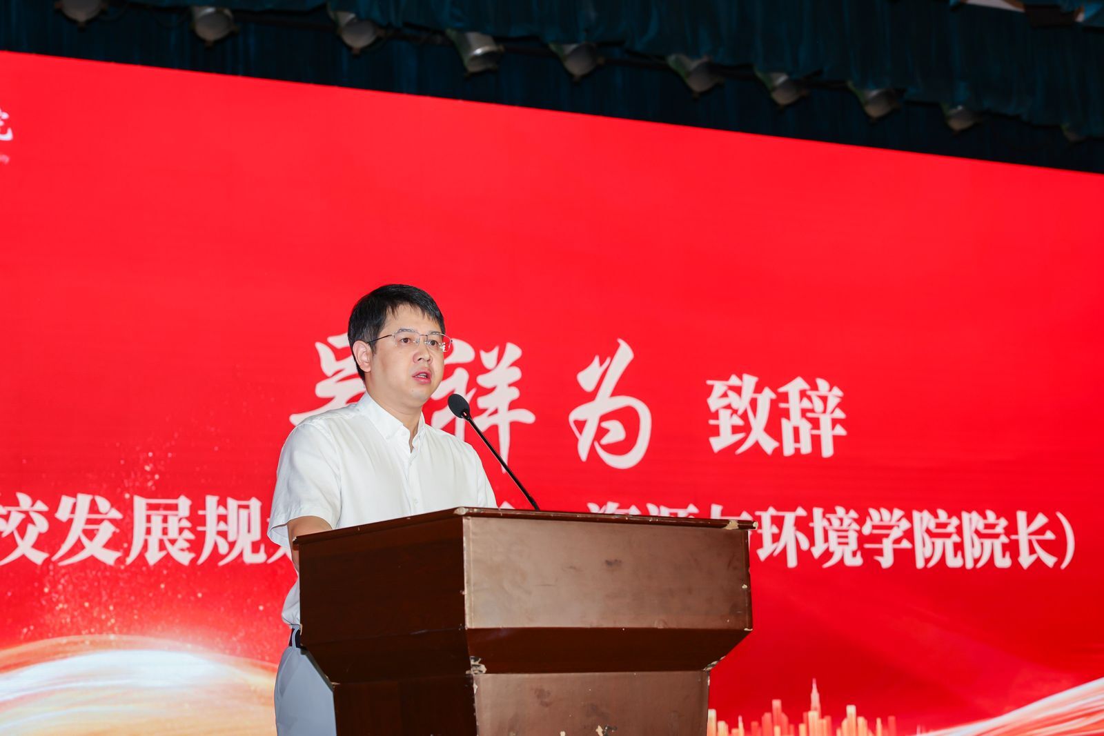 校发展规划处处长、资源与环境学院院长吴祥为致辞。他以《做胸怀远大抱负,勇于拼搏奋斗的出彩资环人》为题,从师资力量、学科专业和人才培养等方面介绍了学院的基本情况,着重介绍了学院近年来在人才培养、学科建设、科学研究、社会服务等方面取得的丰硕成果,以学长身份勉励新生:要生逢其时当奋斗,肩负起时代赋予青年的使命,用奋斗书写青春,努力在世界可持续发展舞台上发出中国青年的声音,描绘自己最美的样子;要造炬成阳涵品格,放眼长远,久久为功,以“咬定青山不放松”的执着和“板凳甘坐十年冷”的恒心,在学习的道路上不断求索,厚积薄发,矢志一步一步取得进步和成绩;要不懈探索尽历练,遇到问题或挫折,能够静下心来,接纳自我,既不钻牛角尖,也不放弃,坚持不懈探索,磨练出更坚定的意志,找到适合自己的路。