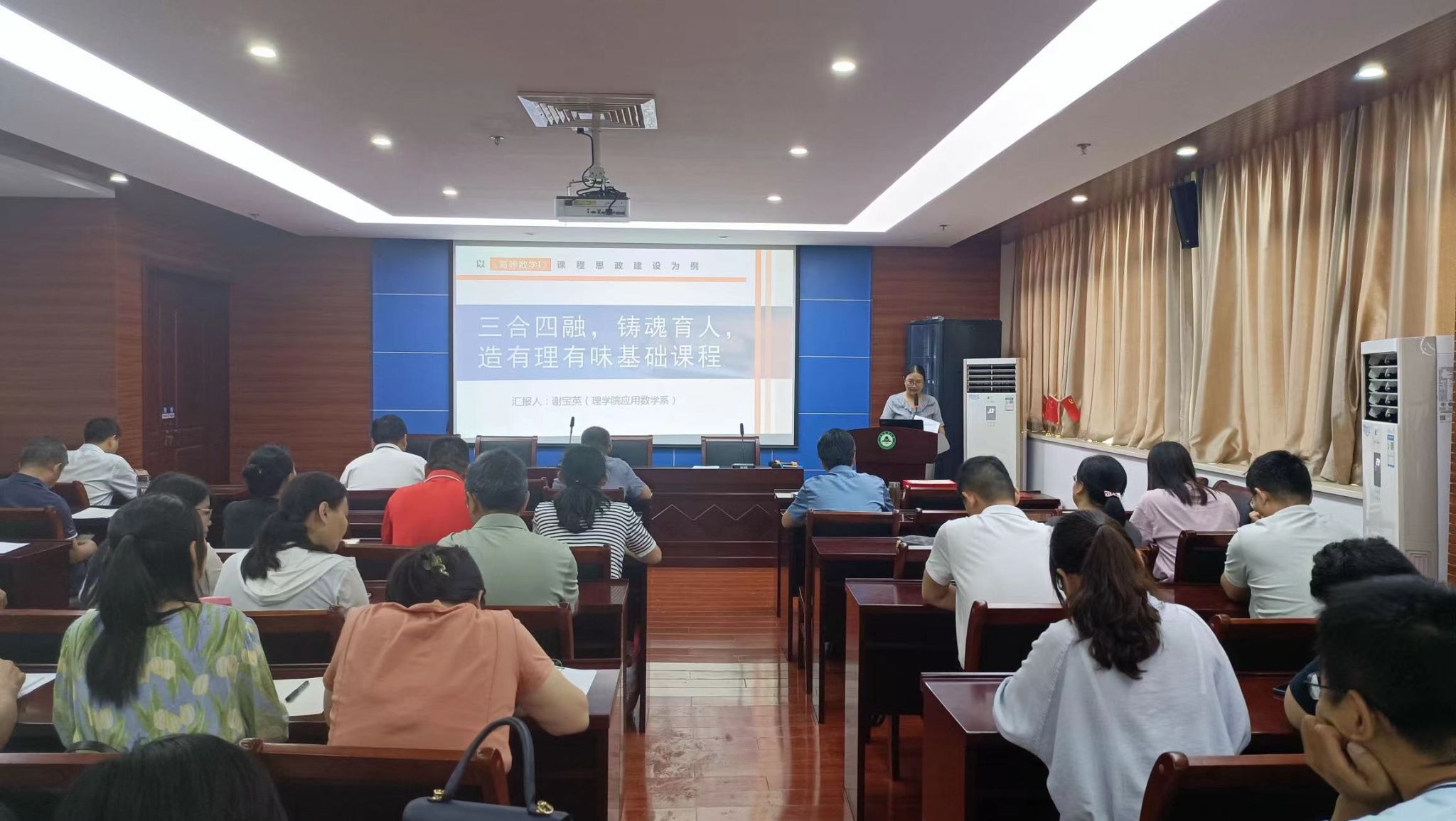 安徽省课程思政教学创新大赛一等奖、第三届“智慧树杯”课程思政示范案例教学大赛特等奖获得者谢宝英,为全体教职工作《三合四融,铸魂育人,造有理有味基础课程》的经验分享,按照“新农科”建设人才培养“厚基础、宽口径”对基础课程的要求,以农业水利工程专业为例,聚焦《高等数学I》在教学中存在“三多三少”痛点问题,明确“三师合力”“四元融通”的建设思路,构建数学、专业、思政三维一体课程思政育人新模式,通过“留-弱-挤-扩、五库共建”重构课程内容,打造有“理”有 “味”内容体系,实现理情共验,促进人才高质量、内涵式培养,启迪学院教师进一步深化教育教学改革,切实提升基础课程教学质量。