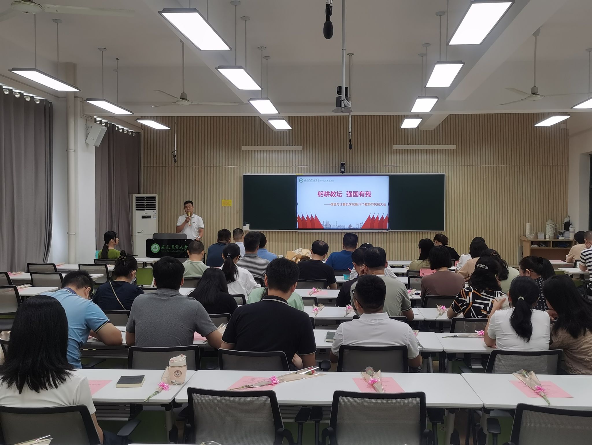 学院党委书记吴辰华在总结讲话中,代表院学院向全体教职工致以节日最亲切的问候,向获得表彰的各位教师表示热烈的祝贺,向始终默默坚守在岗位一线,几十载倾力耕耘的教师们表示衷心的感谢,并结合工作实际,与全院教职工一起回顾了学院取得的一些成绩、存在的一些问题。最后,他以“躬耕教坛 强国有我”为主题,向全体教职工上了一堂党风廉政教育党课,希望全体教职员工要做信仰坚定的传道之师,既要注重言传身教、严格自我要求,又要敢于严格要求学生、关心爱护学生;要做德为人先的品行之师,好教师当是为学为人的表率,是以德立身、以德立学、以德施教的楷模;要做学识渊博的治学之师,广大教师要树立终身学习的理念,把学习作为一种习惯、一种乐趣;要做潜心育人的仁爱之师,在教育过程中,要真诚地尊重学生,充分地理解学生,成为学生的良师益友,引导学生健康成长。