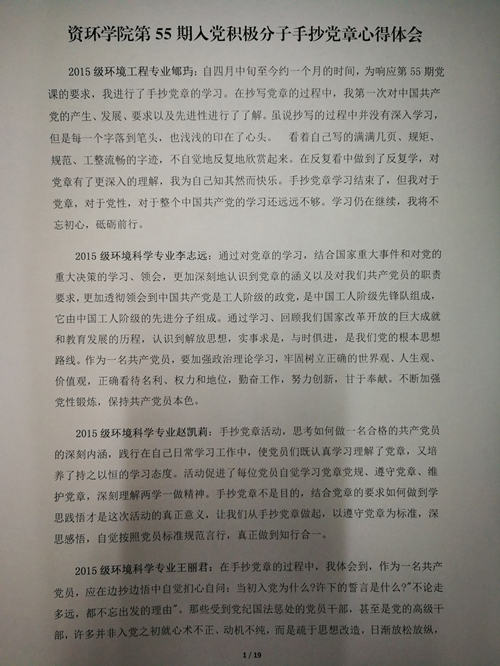 2015级环境科学专业的方宇慧写道:在屏幕和键盘的时代,通过抄写党章,学习党章、尊崇党章、遵守党章、维护党章,深刻理解党规党章的精神实质,自觉提高认识,进一步坚定理想信念,加强党性修养。