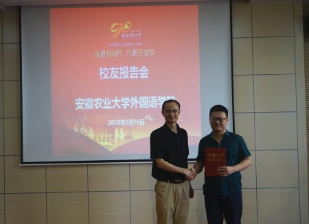 本网讯 5月16日下午,外国语学院“迎校庆”优秀校友报告会第三讲在外语楼502多功能报告厅举行,易口说教育集团CEO、我院2012届英语专业毕业生邹伟向同学们作题为《Dream Conviction Love》的报告,学院党政领导姚莉、孙志农、黄庆华出席报告会,副院长王玉明主持报告会,部分2015-2017级学生及青马班学员参加了报告。