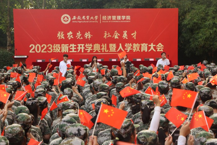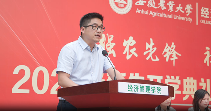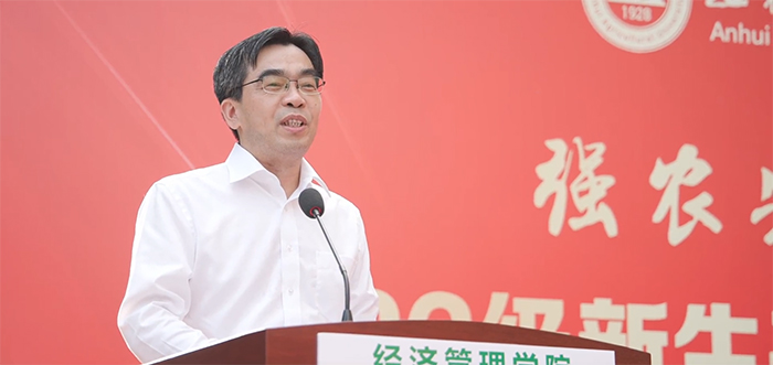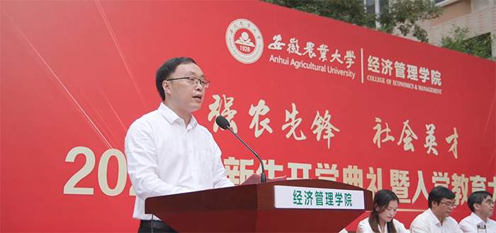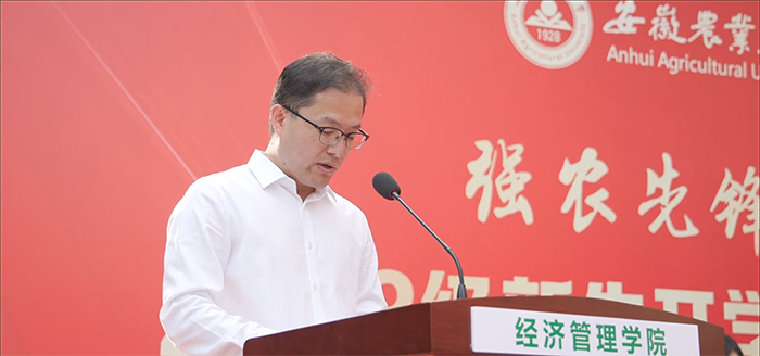 院党委副书记(主持工作)吴国卿代表学院向新加入经管大家庭的同学们表示热烈的欢迎和衷心的祝福,围绕“信仰”“奋斗”“青春”作总结讲话。他寄语新生,要向着信仰之光,做有担当的新时代经管人,牢记学院“尚农固本 经世管邦”的价值追求,明大德、成大才、担大任。要向着奋斗之光,做肯吃苦的新时代经管人,他鼓励同学们既读“有字之书”,又读“无字之书”,用务实勤奋的奋进姿态,在刻苦学习、努力实践中经风雨、壮筋骨、长才干。要向着青春之光,做敢创新的新时代经管人,他勉励同学们学习合肥“创新”精神,用“奋进”“创新”的经管气质,积极涵养创新锐气、磨砺创新意志、培养创新能力,用创新思维拥抱时代之变,绽放青春之光。