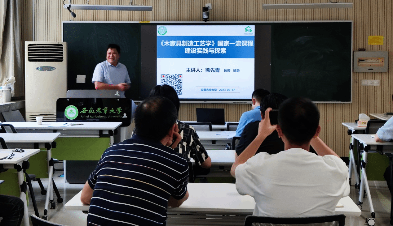 熊先青结合已获批的一流课程作主题为“《木家具制造工艺学》国家一流课程建设实践与探索”报告,从一流本科课程建设政策解读、《木家具制造工艺学》课程建设情况以及一流课程申报心得与体会等三个方面介绍了国家课程建设历程和建设情况、一流本科专业建设的育人育才的指导思想、四维一体的基本原则、基本要求和内容、评价体系以及最终目标。熊先青根据《木家具制造工艺学》国家一流课程建设历程,就国家一流课程申报书的撰写和课程资源建设等方面分享了宝贵经验。熊先青指出,课程思政贯穿课程目标、教学内容和教学活动是国家一流课程建设的关键点。