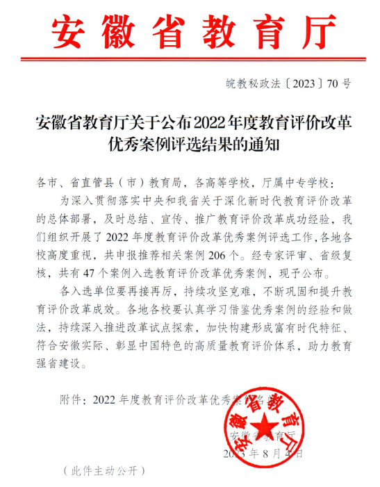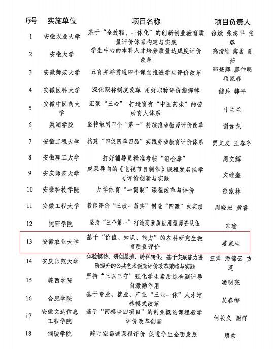本网讯 近日,安徽省教育厅公布了2022年度教育评价改革优秀案例,我校《基于“价值、知识、能力”的农科研究生教育质量评价》获得高等教育评价改革优秀案例。