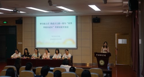 本网讯 为了营造良好的学习氛围,激励广大同学向优秀学姐看齐,5月23日下午,外国语学院在外语楼502报告厅举办了“举引航之灯,照成才之路——我与优秀学姐共成长”经验交流会第二讲,来自2014级英语专业的李鹏鹏、孟玉洁和李文静,法语专业的陶晶蕊以及日语专业的阮玲霞和吴明慧6位同学应邀与学弟学妹们展开面对面、心与心的交流,现场座无虚席,气氛十分活跃。
