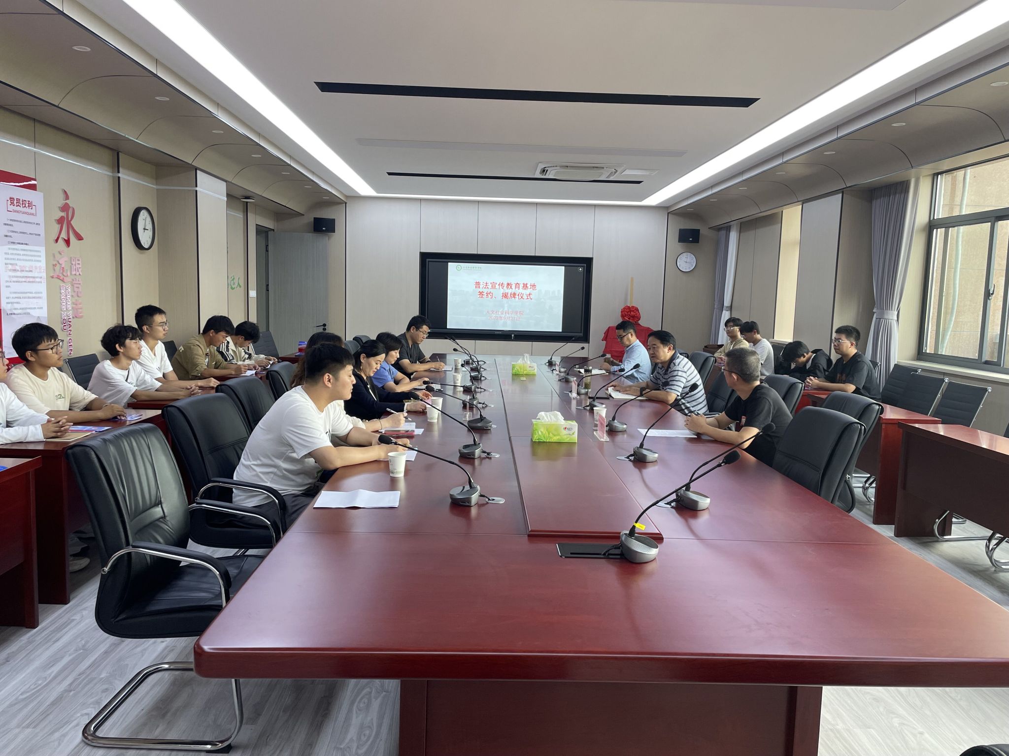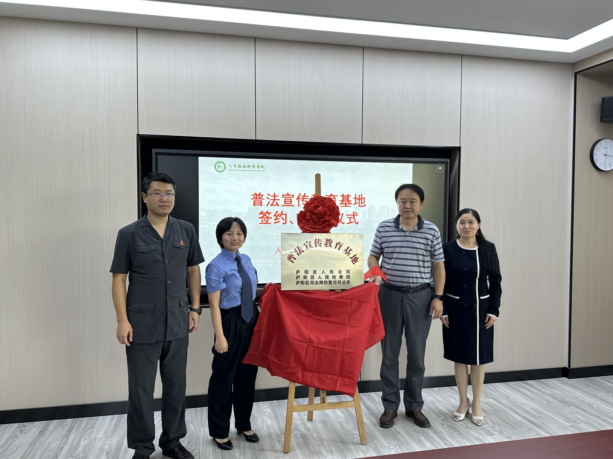 人文社会科学学院院长黄洪雷,学院党政办、法学系相关负责老师、庐阳区人民法院审管办主任王鹏、庐阳区人民检察院第一检察部主任赵婕、庐阳区司法局四里河司法所主任汪丽、副所长王卓妍以及法学系学生代表参加普法宣传教育基地签约、揭牌活动。