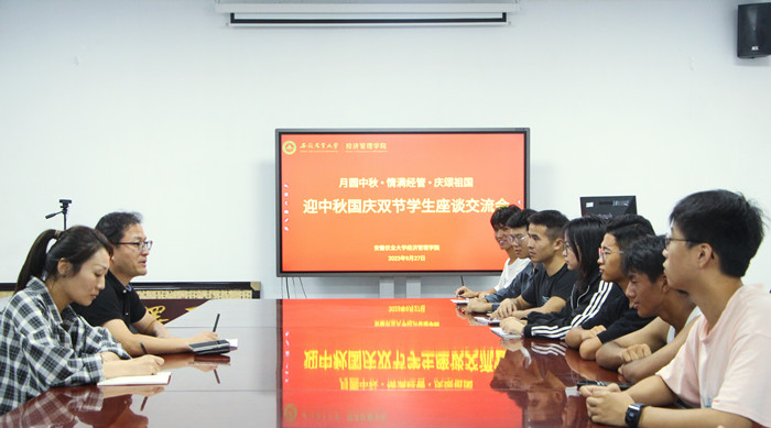 9月27日晚,经济管理学院召开“月圆中秋·情满经管·庆颂祖国”庆中秋、国庆双节学生座谈交流会,学院党委副书记、纪委书记周涛,团委老师,2023级各专业新生代表及国庆假期少数民族留校学生,2020级优秀党员代表等30余名学生参加了此次会议。座谈会上,2023级新生代表围绕入学近一个月的学习和生活状况进行了分享,少数民族学生结合自身的成长环境和在校感受进行了发言,并提出了初入大学所面临的困惑。周涛代表学院对新生提出的各项问题依次进行了细致回答,并邀请高年级优秀党员代表结合自身的学习方法、学生干部任职经历进行了经验分享。周涛表示,大学是学生锻炼提升的最佳平台,希望同学们能够树立正确目标、养成良好习惯,脚踏实地、学有所获。最后,向全体学生代表送上了诚挚的节日祝福和暖心的节日慰问。