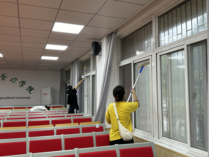 为进一步提升经管楼环境状况,以干净整洁的面貌迎接中秋、国庆双节,经济管理学院于9月27日下午开展“迎双节·焕新颜”爱国卫生大扫除活动。此次活动共招募学生志愿者200余名,活动开始后,各清扫小队分工明确、行动高效,从桌椅到地面、从教室到走廊、从室内到室外,随处可见辛勤劳动的身影,他们扫地拖地、擦窗户桌椅、倒垃圾杂物、清枯枝落叶,对四季小花园、劳动小天地、经管楼内、楼前广场、西侧、东侧、北侧7块区域进行了全面清理维护。在大家积极配合和通力合作下,整个经管楼焕然一新,以一个更加干净整洁、健康有序的面貌迎接中秋、国庆双节的到来。