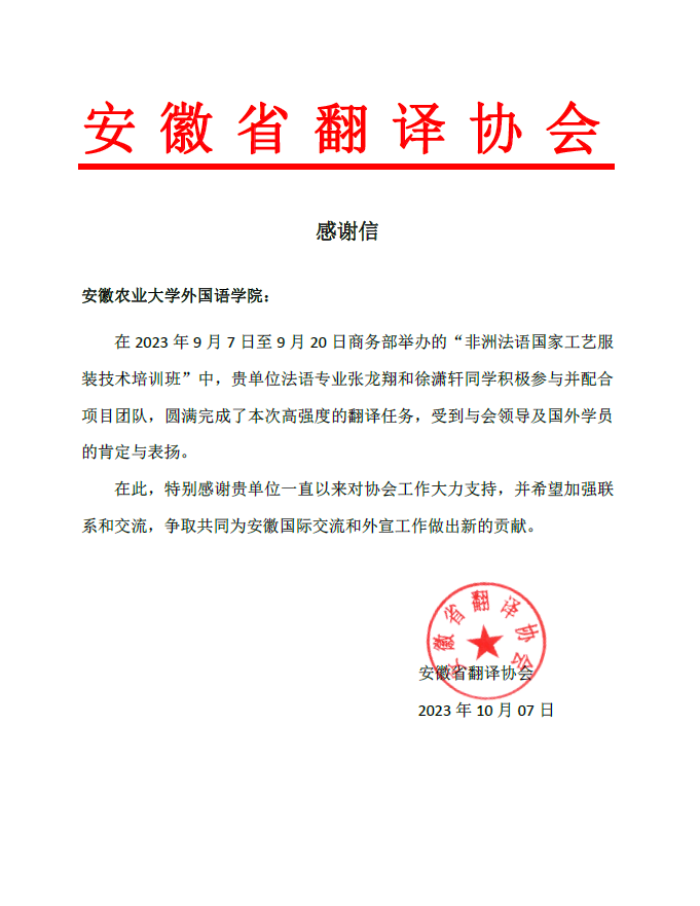 本网讯 近日,安徽省翻译协会向外国语学院发来感谢信。在今年九月份由商务部主办、安徽省商务厅承办的《非洲法语国家工艺服装技术培训班》活动中,外国语学院法语专业张龙翔和徐潇轩两位同学以扎实的法语语言基本功、熟稔的国际交流礼仪以及饱满的工作热情,圆满完成了为期15天的法语翻译志愿者服务工作,获得了此次活动语言服务志愿者选用单位安徽省翻译协会的书面表彰,展现了外国语学院学子优秀的外语能力和良好的精神风貌。(作者:倪复生 一审:葛德智 二审:许宗瑞 三审:何如海)