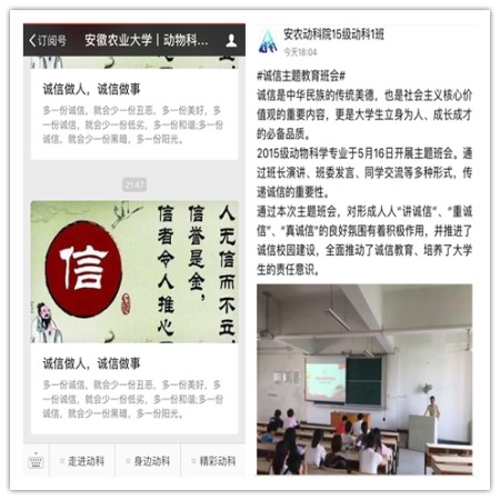 5月15日-31日,动物科技学院利用学院微信、微博和QQ群在全院范围内广泛宣传诚信的重要性,大力倡导大学生要怀有感恩之心,践诺于行。学院学生班级和同学们响应号召,踊跃转发,积极互动,发出了自己的诚信宣言。